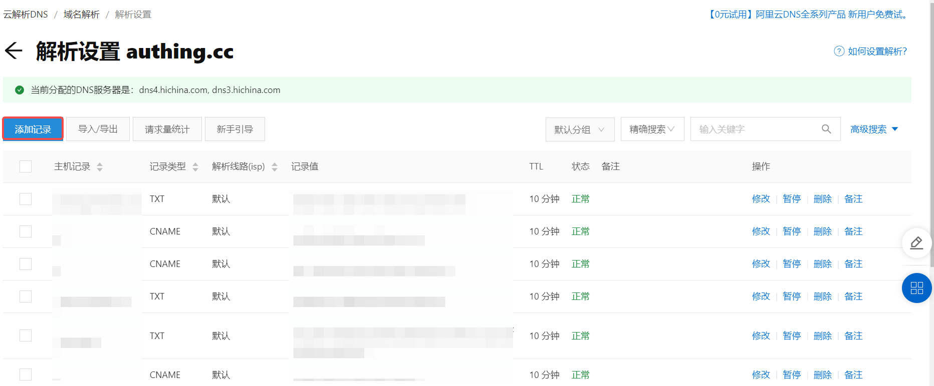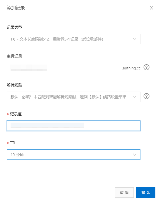 记录值填写 Authing 生成的 TXT 对应的值​。