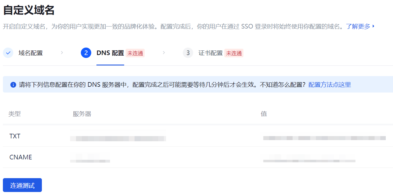 在阿里云完成 DNS 配置之后,即可在 Authing 的 DNS 配置页面进行连通测试,一般来说域名解析配置完成之后需要一段时间生效,如果已经完成配置但没有连通测试成功,可以稍作等待。