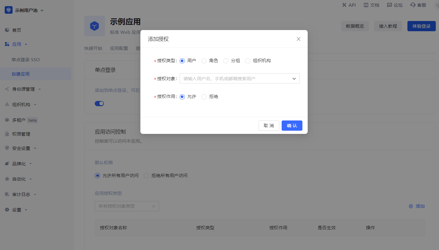 企业管理员或具有 Authing 控制台权限的管理员(管理员及添加协作管理员详情可见 添加用户池协作管理员)登录 Authing 控制台 应用->单点登录 SSO->应用列表->某应用详情页->访问授权,在 应用访问控制 模块设置访问应用的权限。