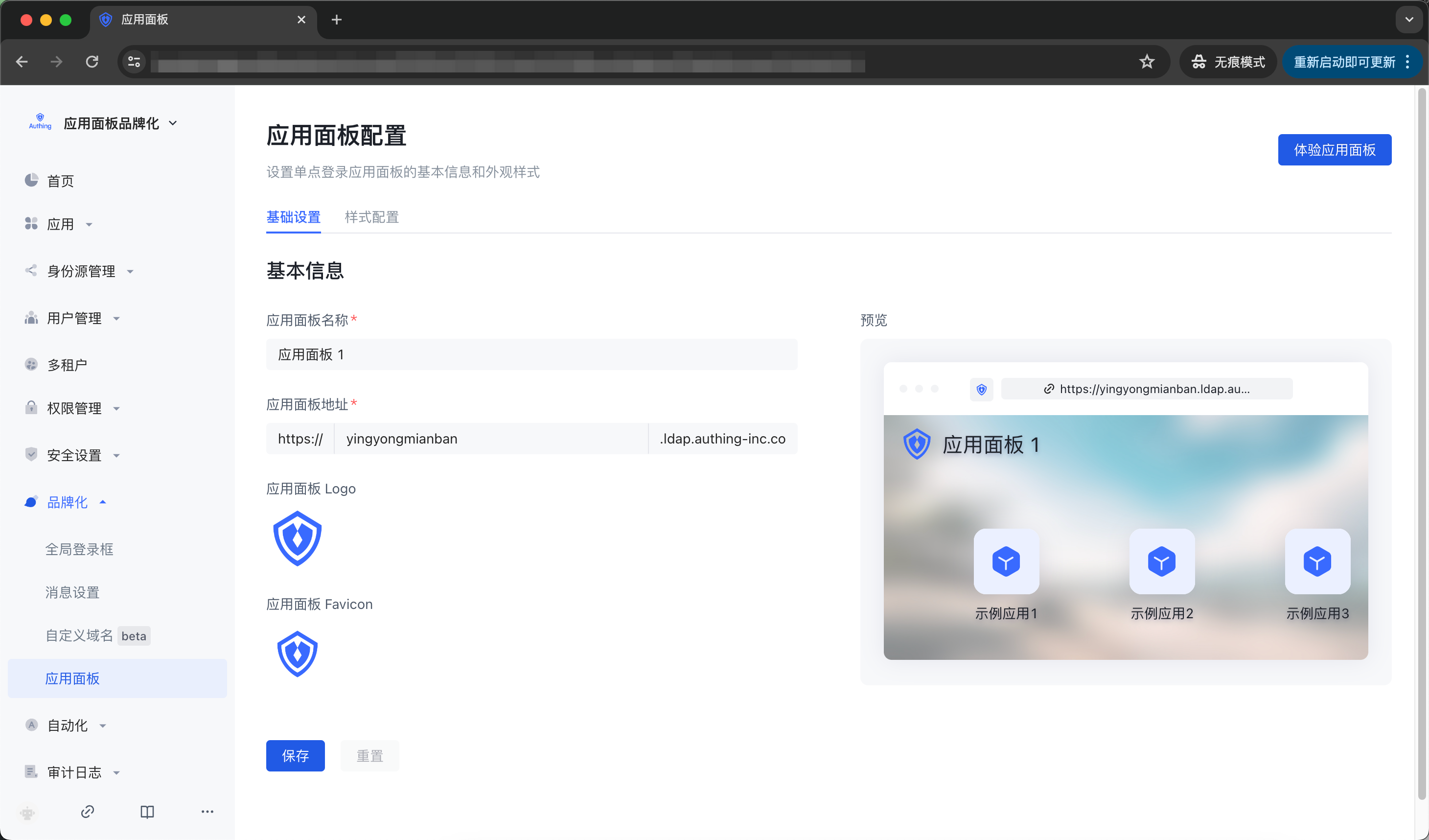 企业管理员或具有 Authing 控制台权限的管理员可以进入控制台 品牌化->应用面板->基础设置 和 应用->单点登录 SSO->配置 来配置应用面板的基本信息、登录注册方式、社交登录方式、企业登录方式等(有关详情,请参阅 登录控制 及 应用面板配置 (opens new window))。