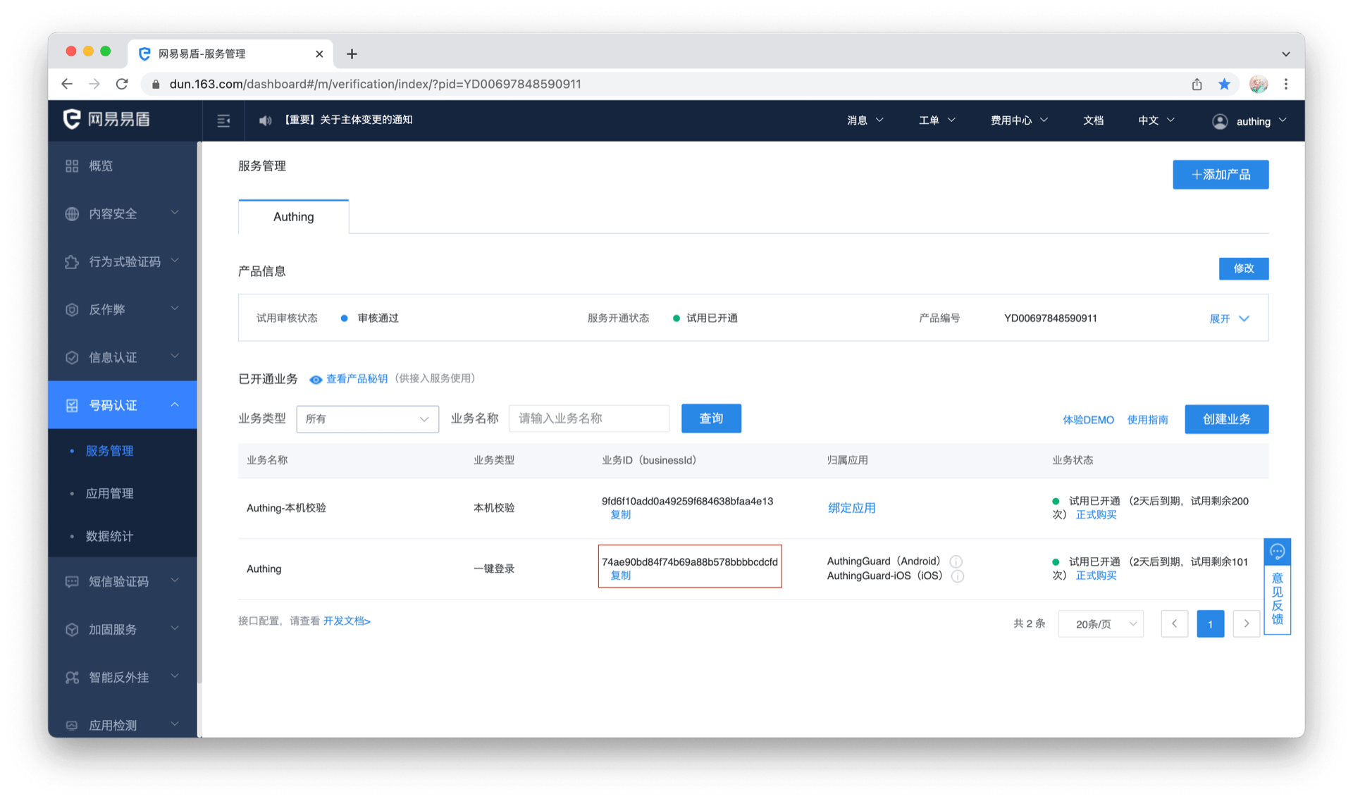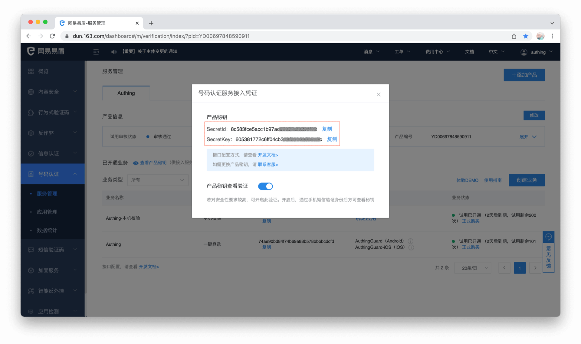将易盾后台信息填入 Authing 控制台