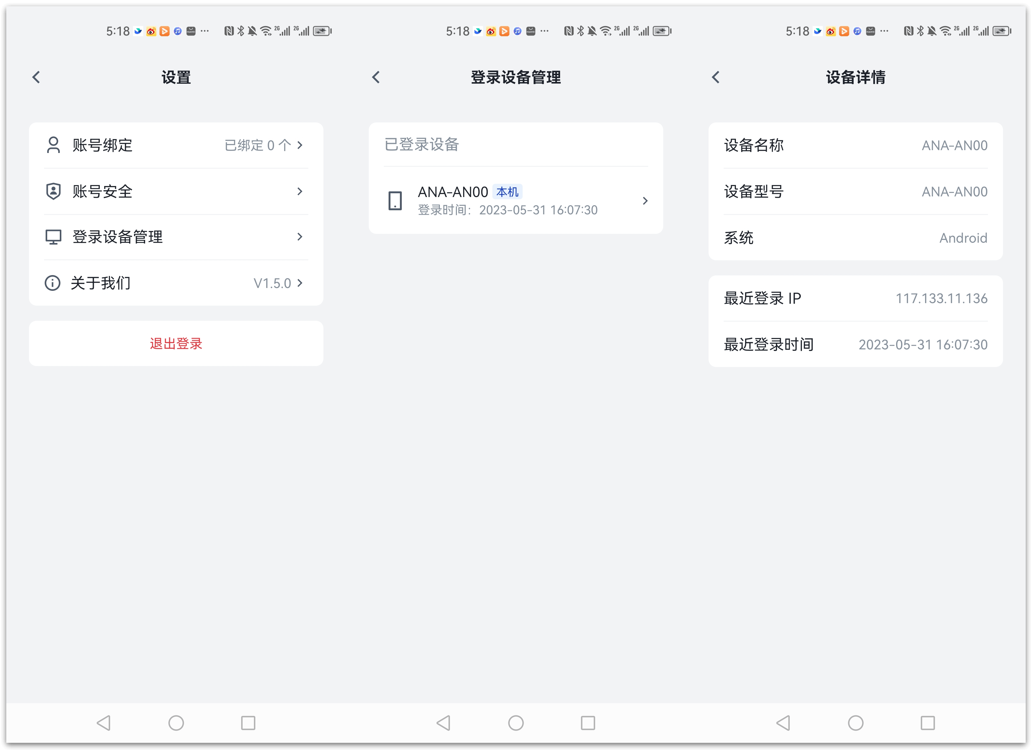 - 在设备管理列表,点击某一条设备信息,进入到该设备的信息详情页面,可以看到所有使用该设备的账号信息、设备的安全信息及活跃信息;