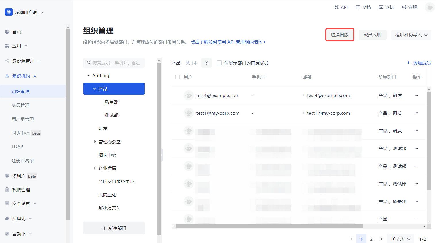 - 当前新旧版本组织机构功能并行,你可以根据需要选用。要切换新旧版本,可以在 组织机构->组织管理 页面点击页面右上角 切换旧版 / 切换新版 按钮。
