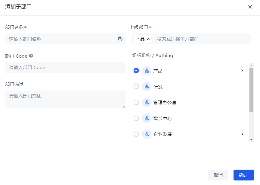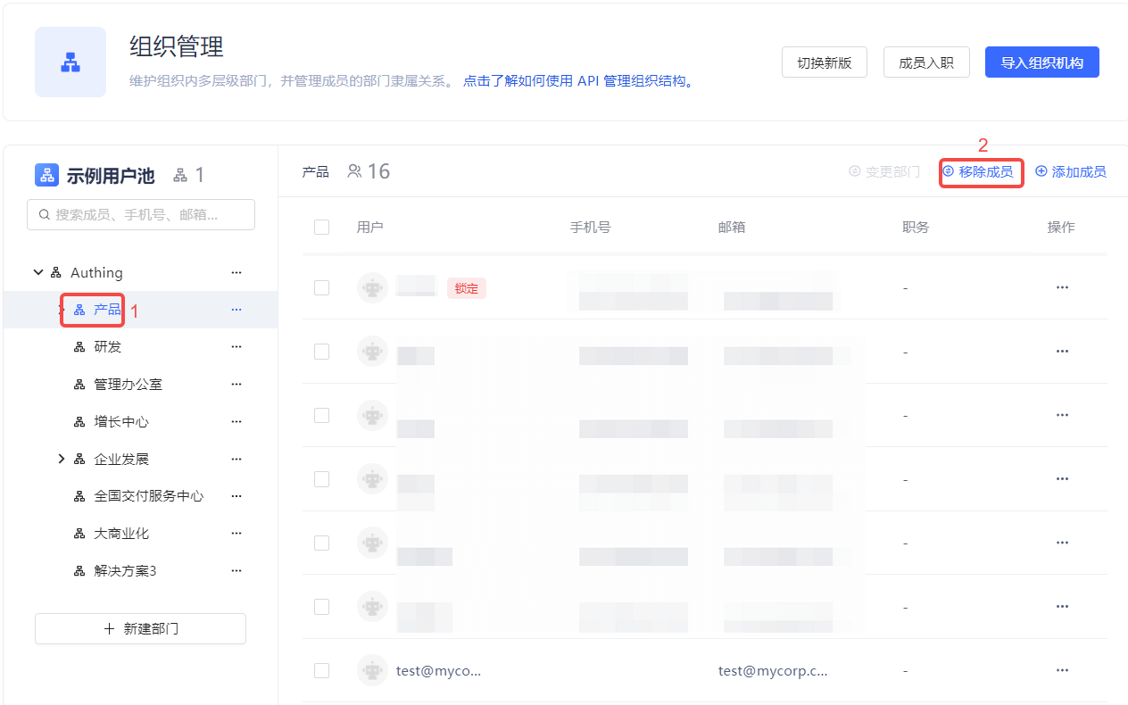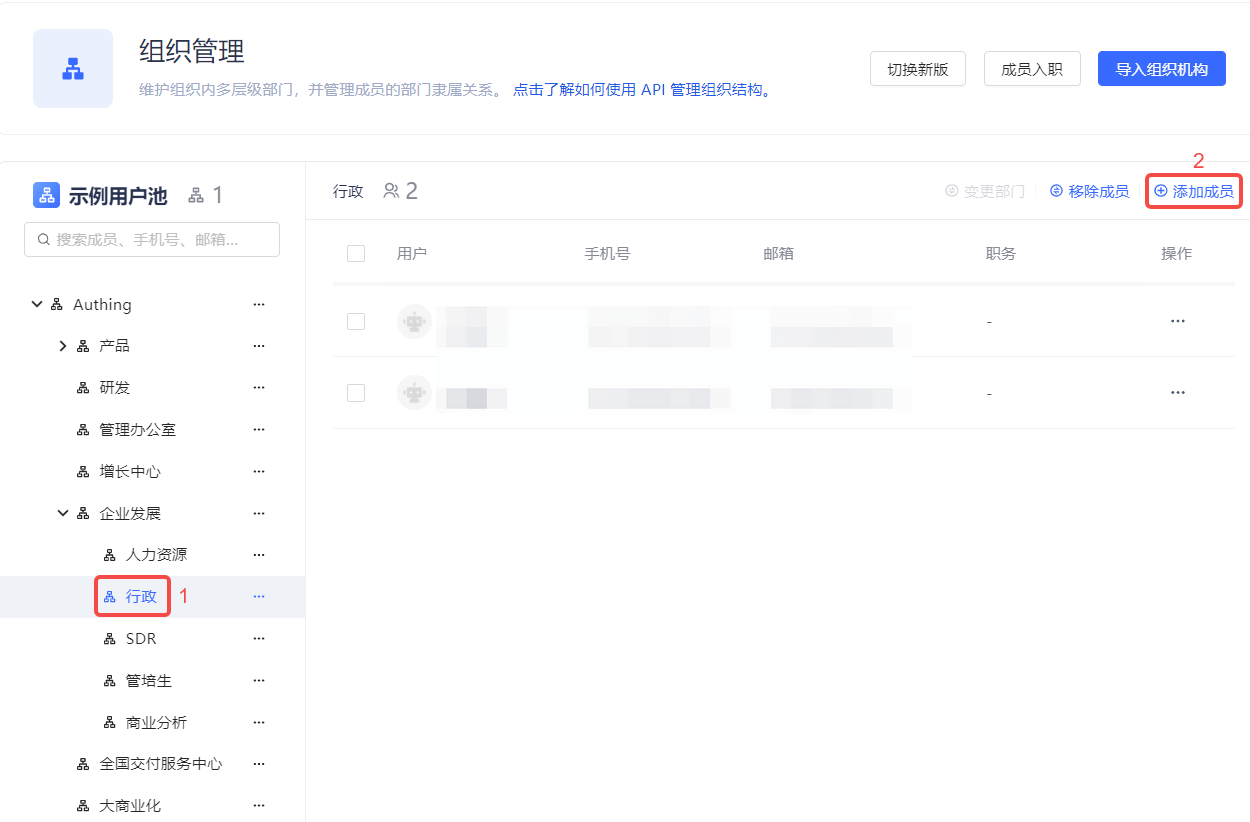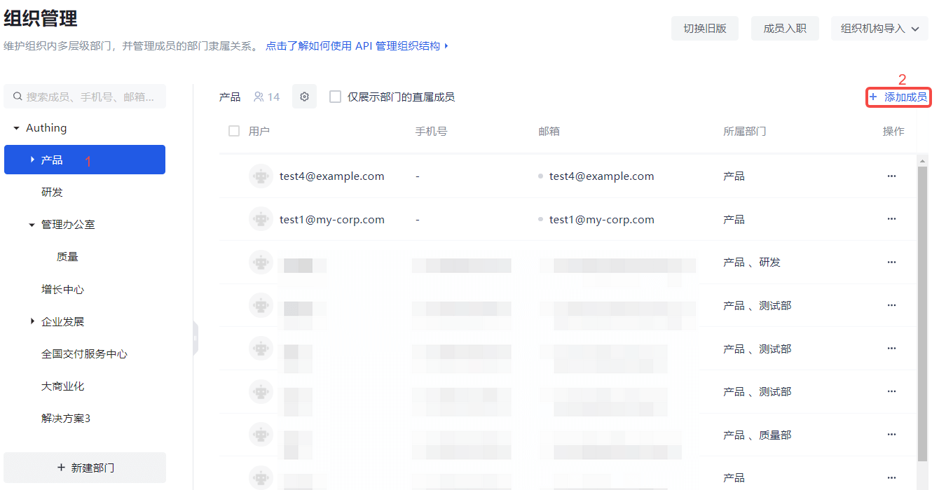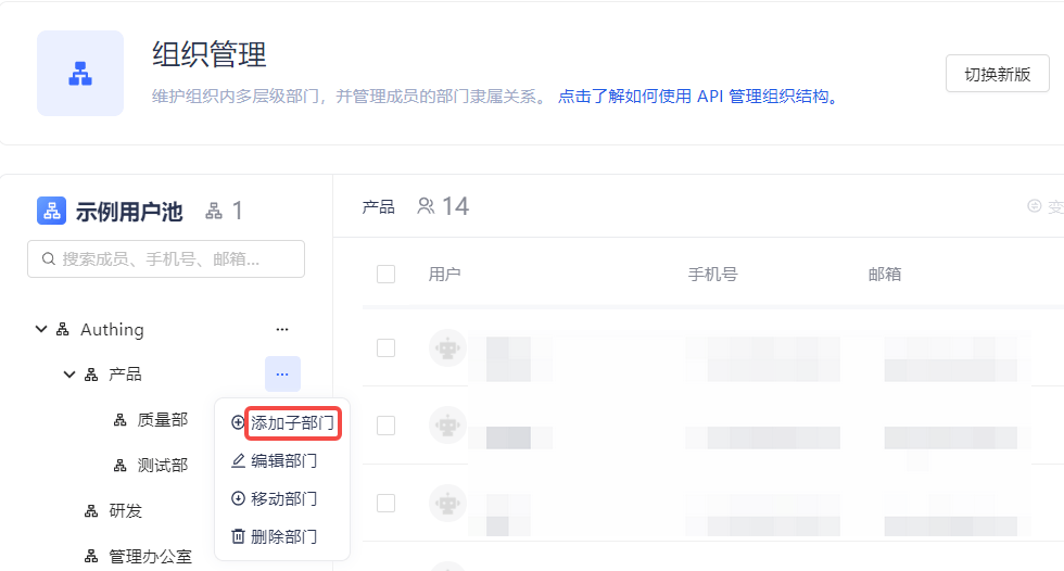 组织机构的管理包含添加子部门、修改部门、删除子部门、移动子部门、获取子部门列表、添加成员、删除成员、获取成员列表等操作,Authing 支持控制台和 API & SDK 两种操作方式。