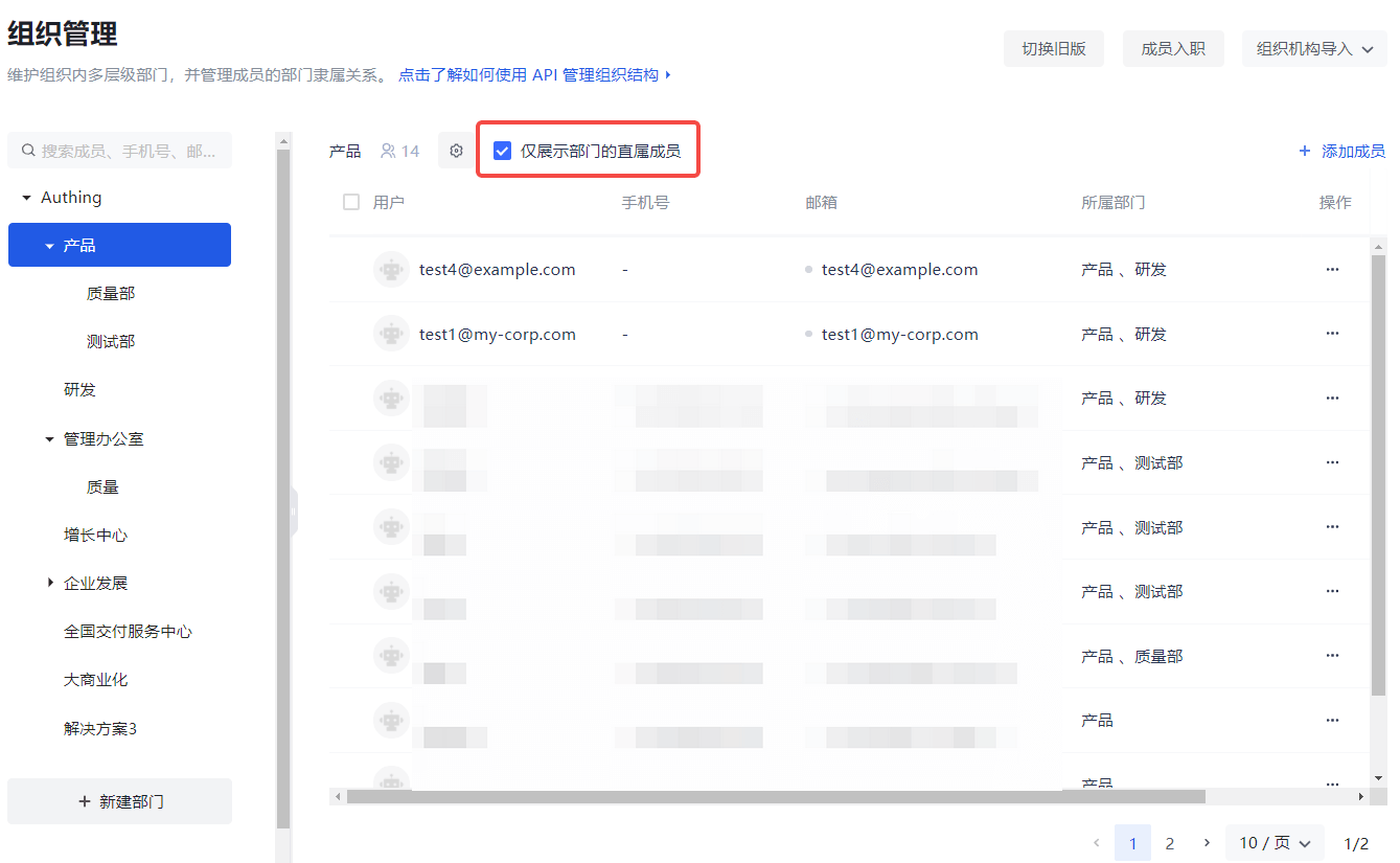 - 当前新旧版本组织机构功能并行,你可以根据需要选用。要切换新旧版本,可以在 组织机构->组织管理 页面点击页面右上角 切换旧版 / 切换新版 按钮。
