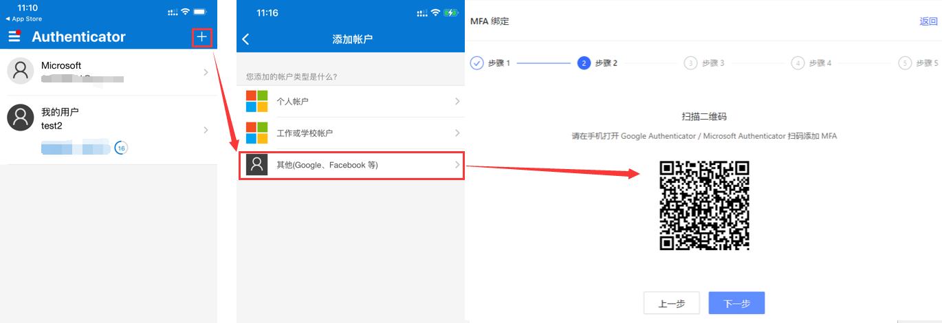 b. 在手机端下载并打开 Google Authenticator / Microsoft Authenticator APP(下文以 Microsoft Authenticator 为例添加 MFA。),点击右上角 + 按钮,选择 其他(Google、Facebook 等), 扫码添加 MFA。