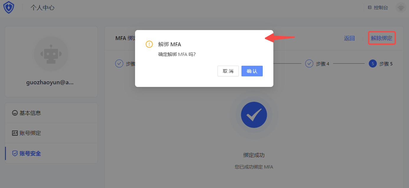 在打开的 MFA绑定 页面右上角点击 解除绑定 按钮,并确认解绑。