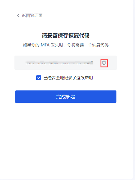 务必将这里展示的恢复代码妥善保存。如果以后丢失了 MFA、无法通过 MFA 口令登录,可使用这个密钥来恢复账号访问。