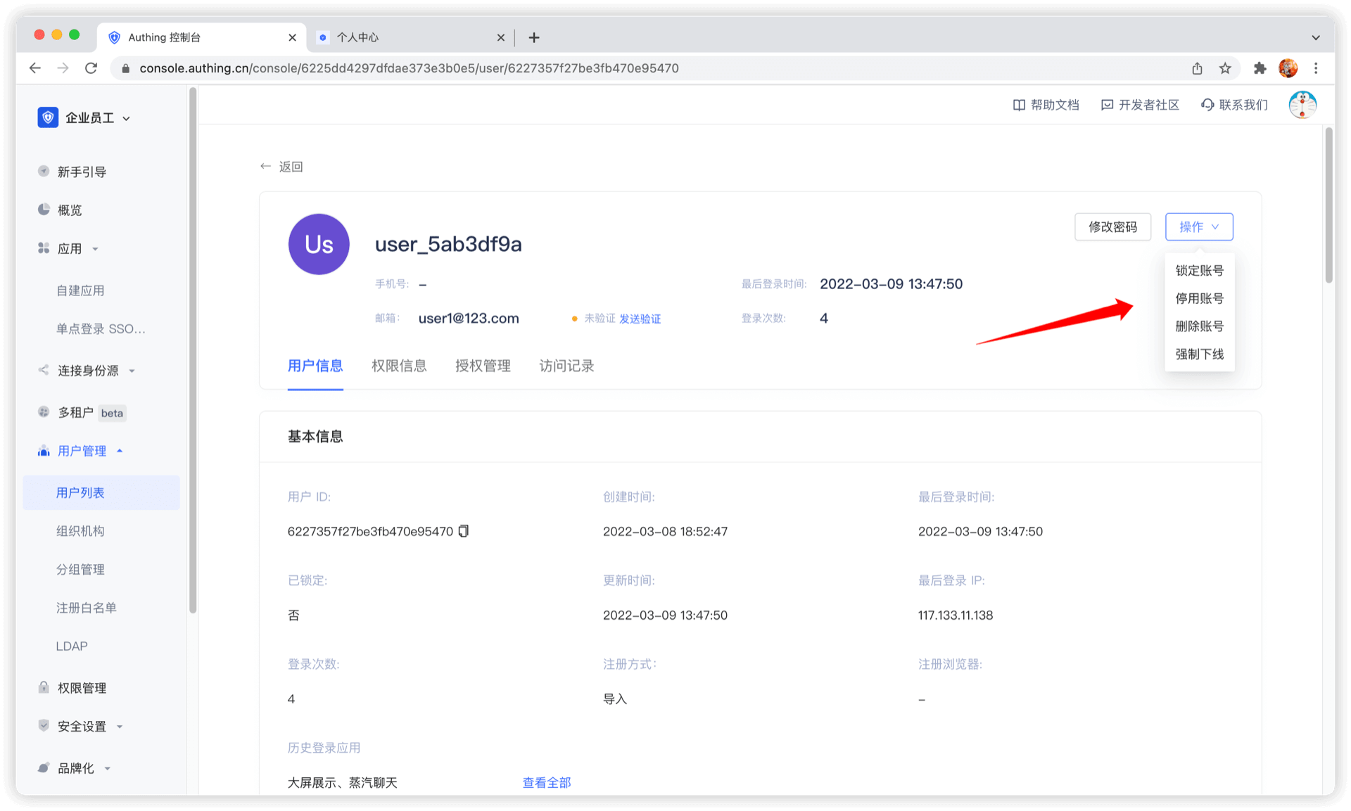 管理员可以在用户详情页禁用账号,被禁用的账号将无法再次登录: