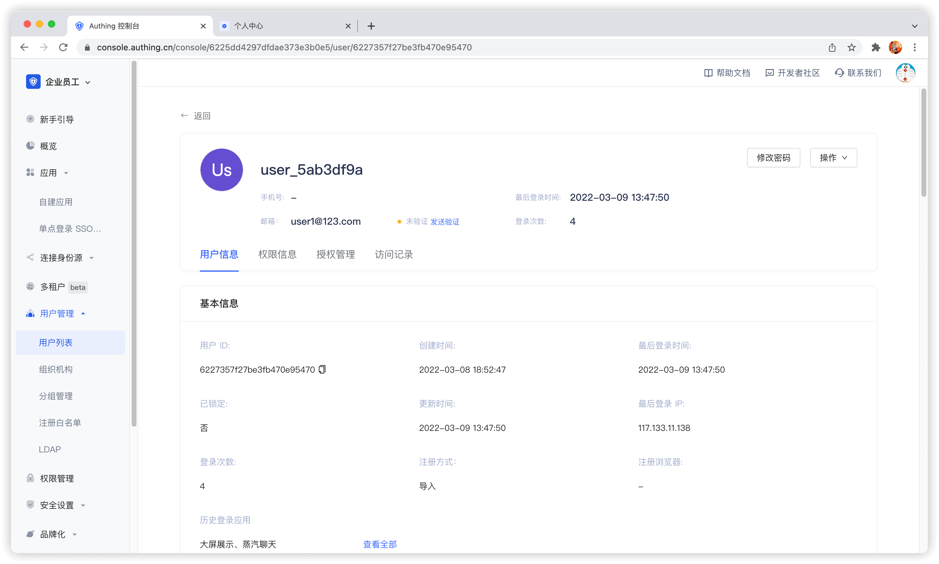 Authing 提供了一个内置的用户个人中心页(地址为 https://<YOUR_DOMAIN>.authing.cn/u),可以完成用户基本信息的修改: