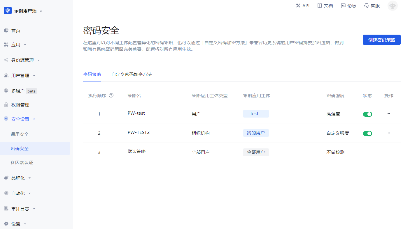 你可以在 安全设置->密码安全 页面中配置密码强度,设置密码强度后系统会要求所有用户注册、修改密码时,密码必须满足一定的复杂度。