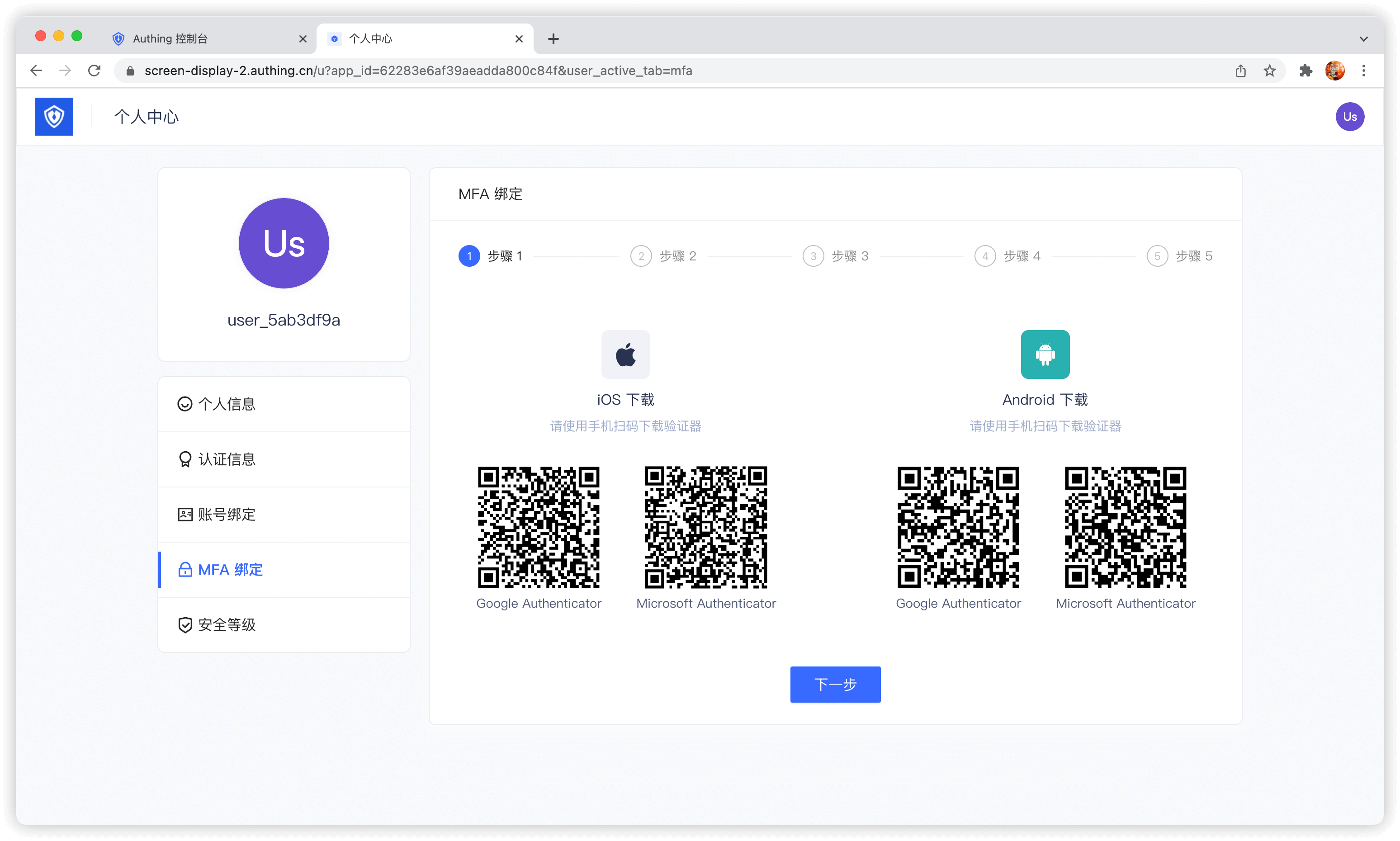 绑定个人 MFA 后,用户在登录时需要进行二次验证,更有效的保障用户的账户安全。终端用户可以在应用个人中心(地址为 https://<YOUR_APP_DOMAIN>.authing.cn/u)绑定 MFA,你也可以使用 SDK 来操作。