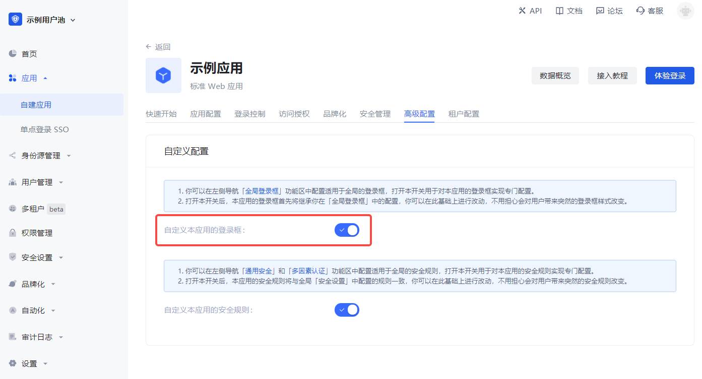 a. 在 应用->自建应用->应用详情页->高级配置 标签页开启 自定义本应用的登录框 开关。