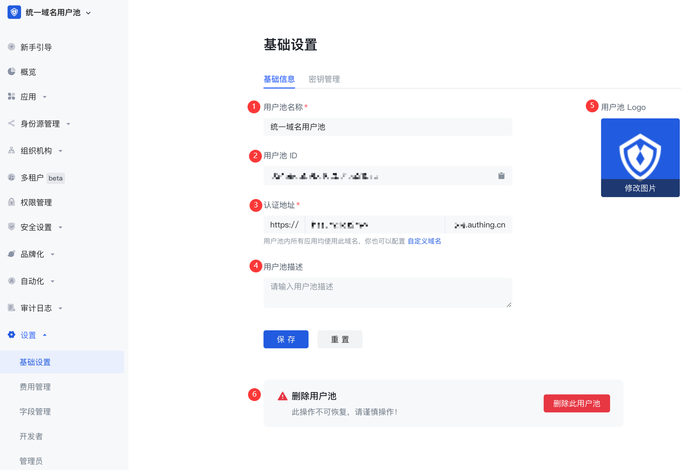 管理员可以在 基础信息 标签页执行修改用户池基本信息、配置用户池认证地址、删除用户池等操作。