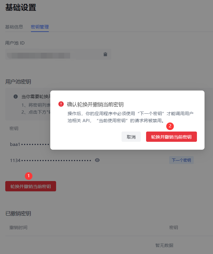 查看弹窗的提示信息,并点击 轮换并撤销当前密钥 进行确认。