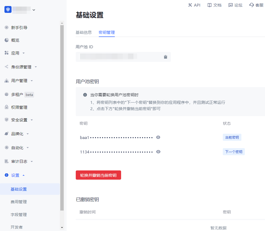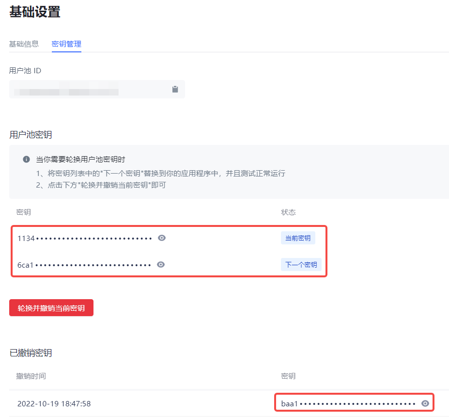 - 提示「轮换密钥成功」,当前密钥 会被禁用并进入 已撤销密钥 列表,下一个密钥 的状态变更为 当前密钥,并自动创建新的 下一个密钥。