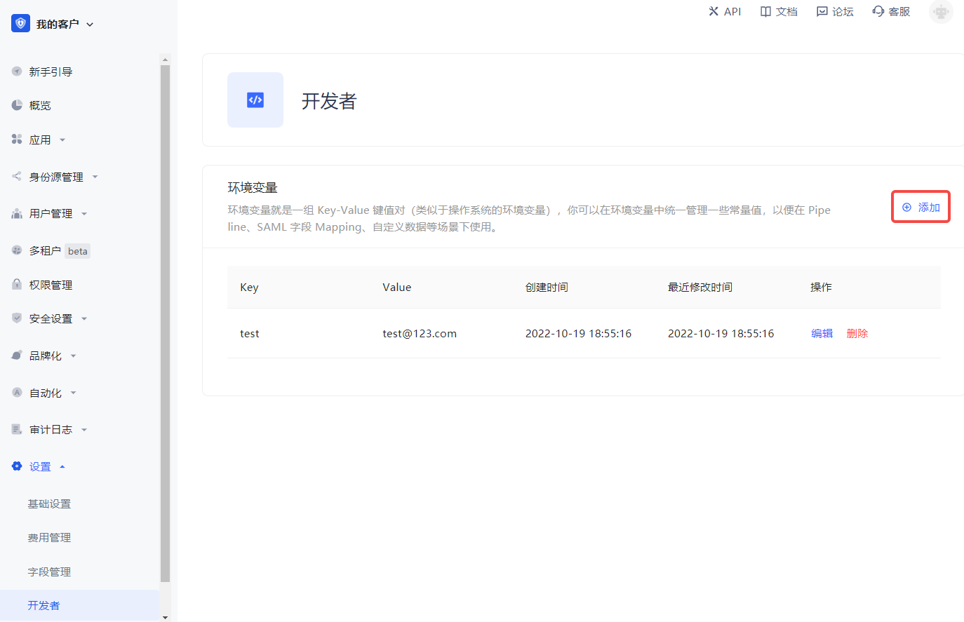 开发者可以配置环境变量。环境变量就是一组 Key-Value 键值对(类似于操作系统的环境变量)。你可以在环境变量中统一管理一些常量值,以便在 Pipeline、SAML 字段 Mapping、自定义数据等场景下使用。