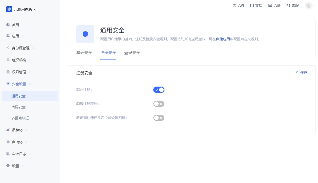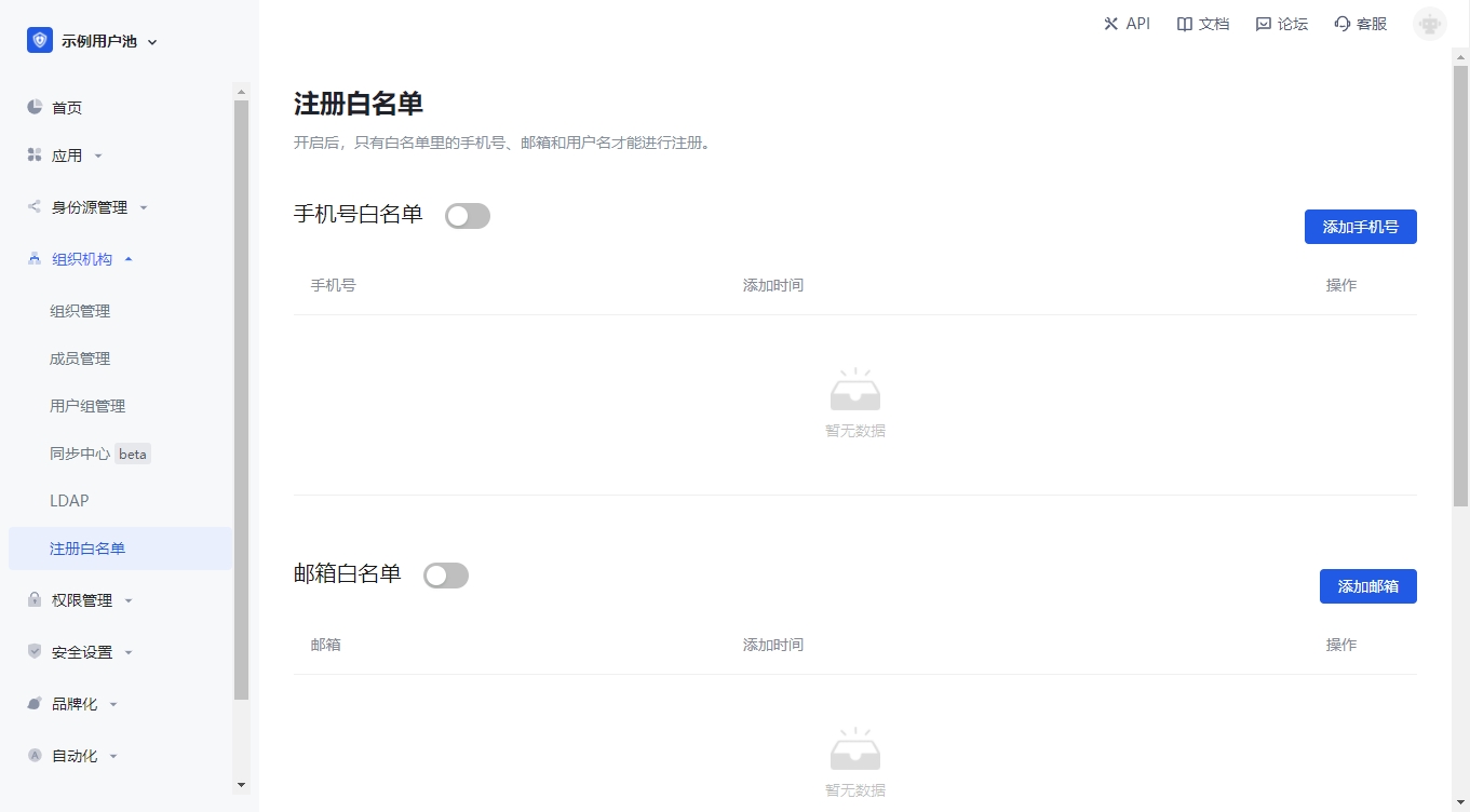 你可以在在控制台的 组织机构->注册白名单 中开启邮箱、手机号、用户名白名单,开启之后只有在白名单内的手机号、邮箱、用户名才能注册(管理员手动创建账号不受限制)。