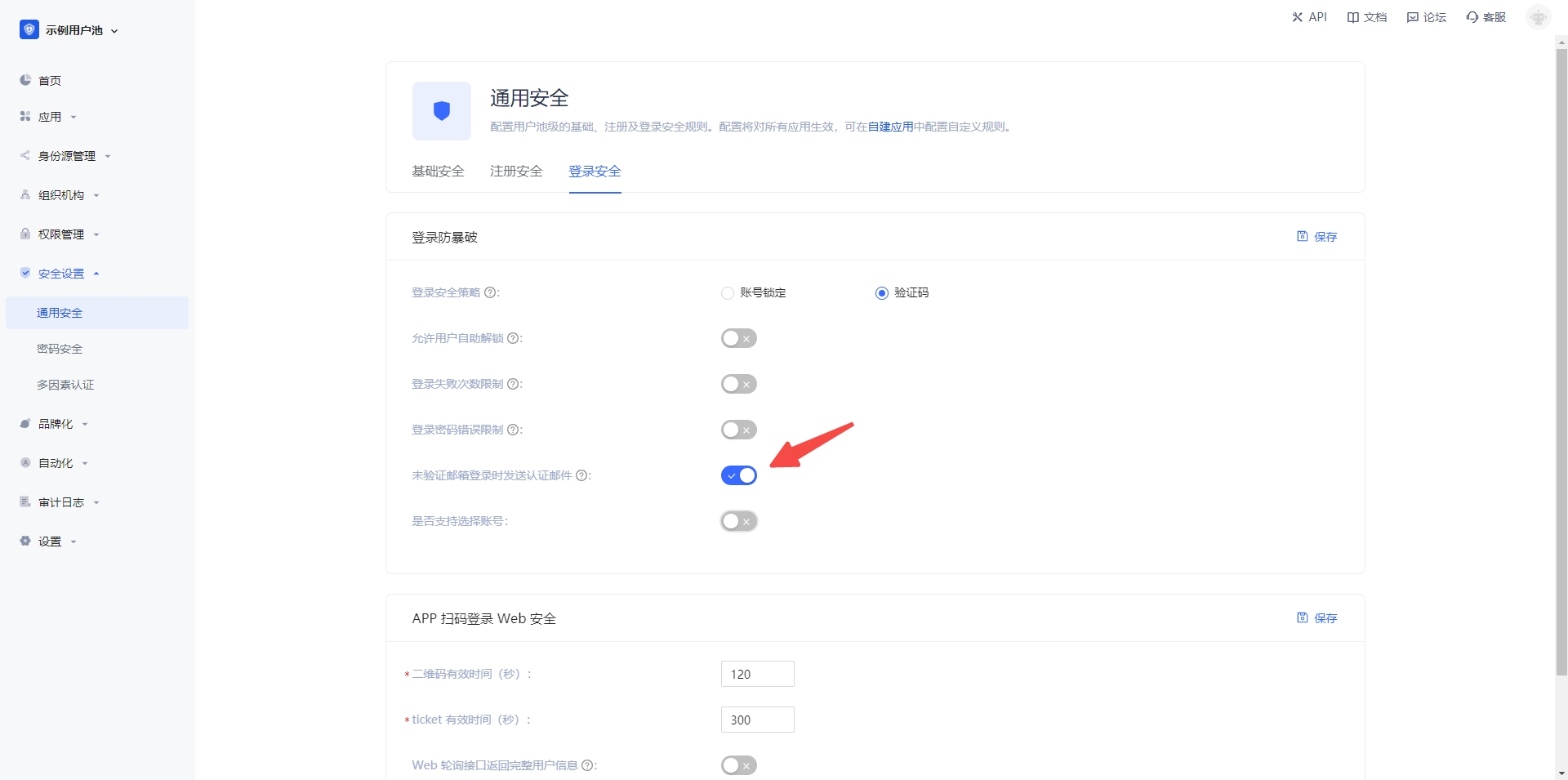 默认情况下,未验证邮箱的账号可以进行登录,你也可以在 安全设置->通用安全->登陆安全 中修改此配置: