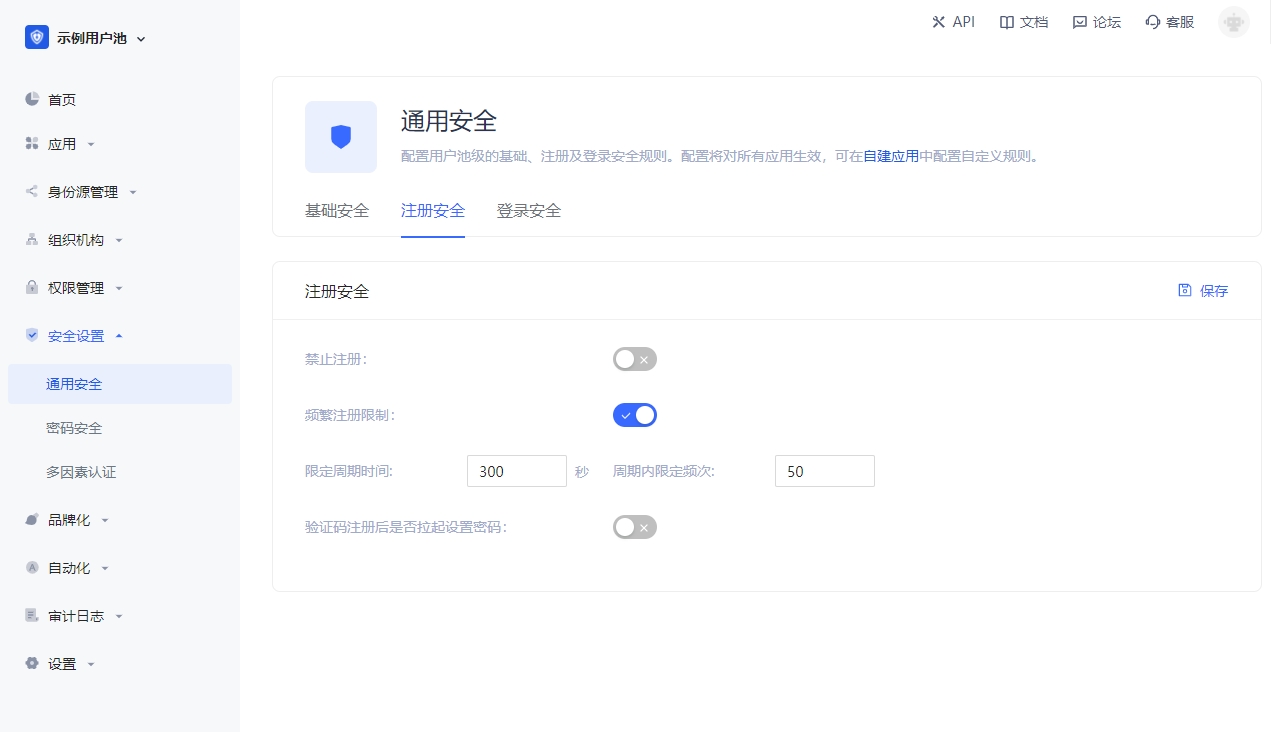 你可以在控制台的 安全设置->通用安全->注册安全 中开启 频繁注册限制 开关,限制在多少秒内不能超过多少次注册: