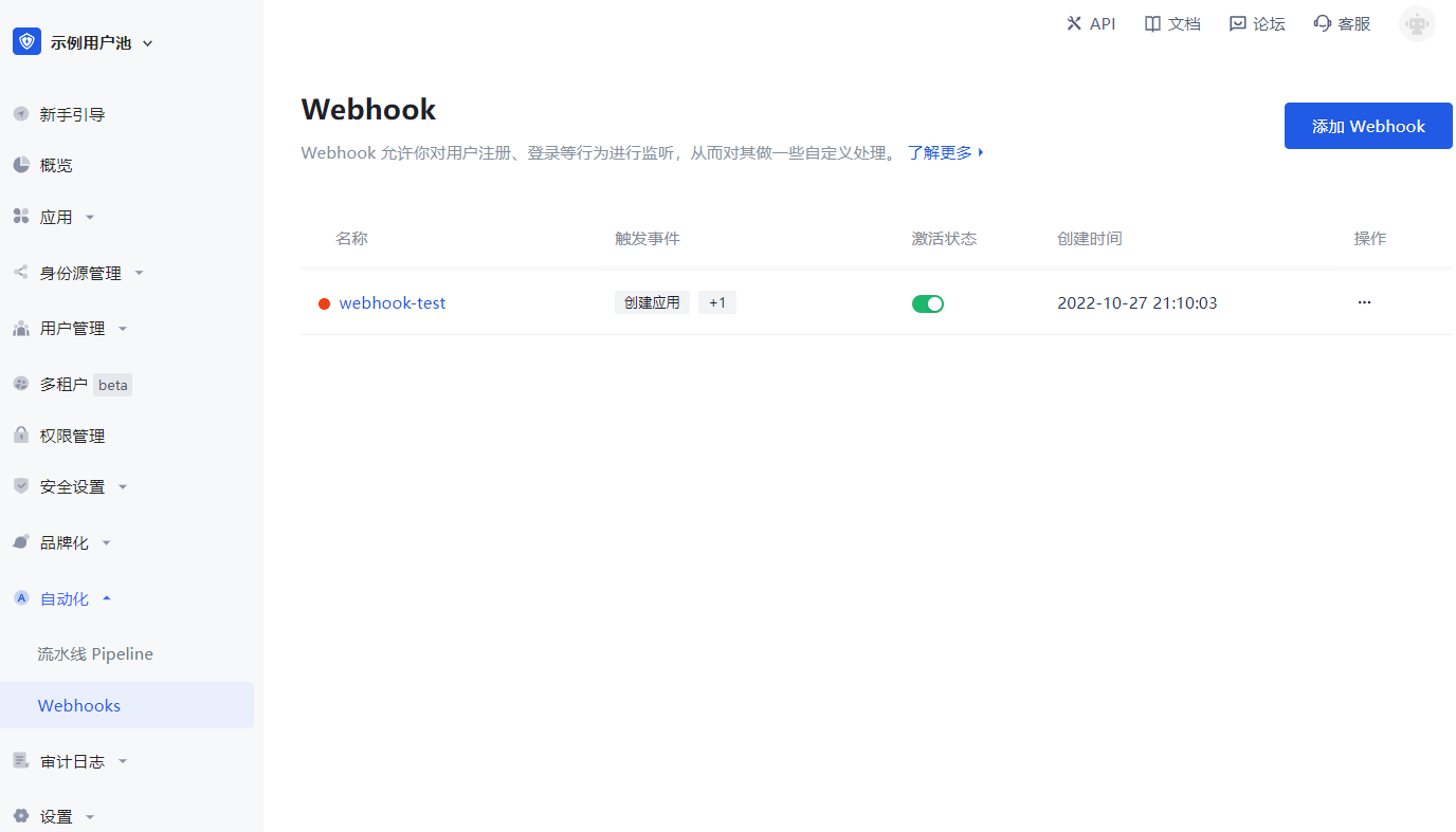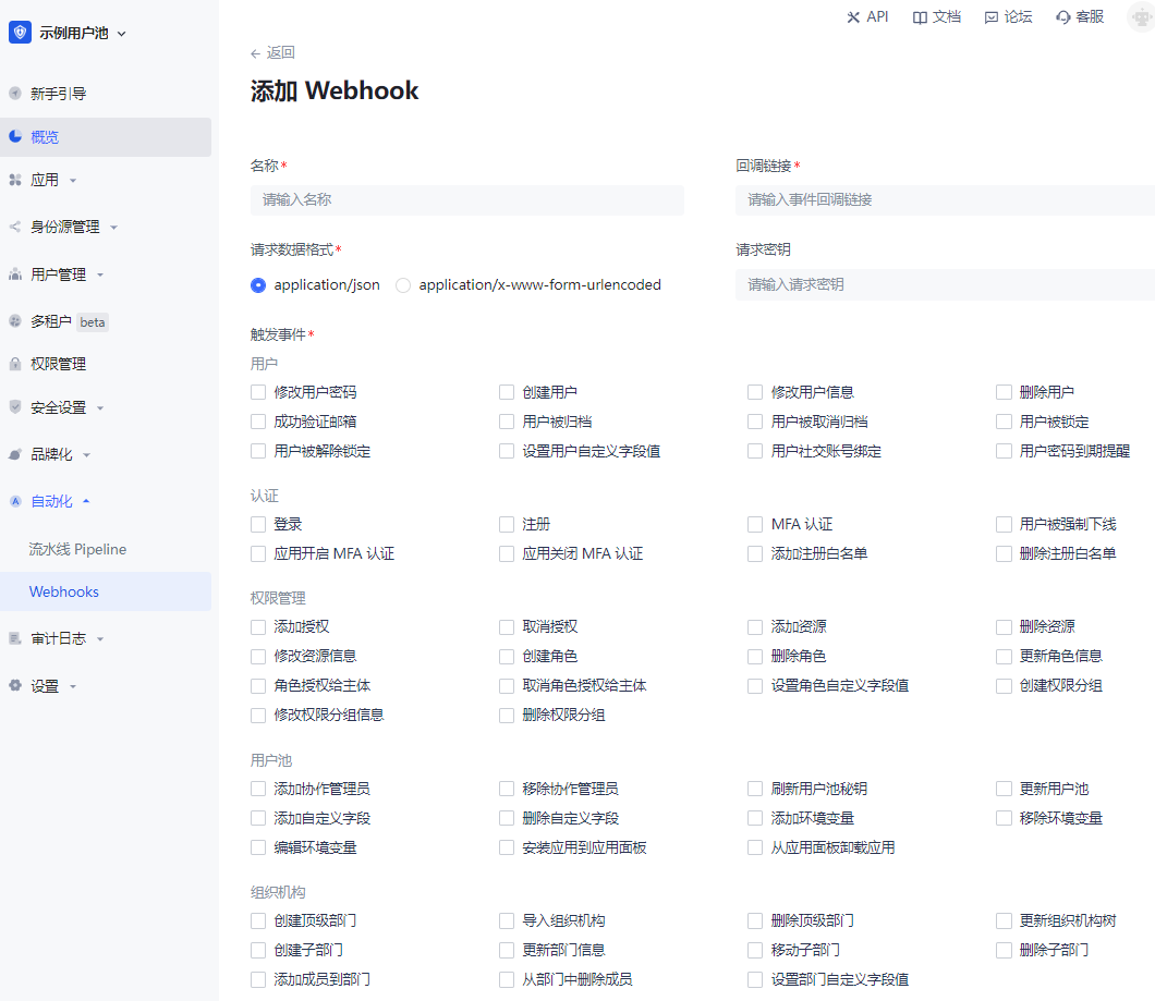 有关支持「Webhooks」功能权益的 Authing 用户池版本信息,请查看 官网「价格」页 (opens new window)。如你的版本不支持此权益,且想试用,可开通体验期。有关体验期介绍及开通方式,请查看 体验期。