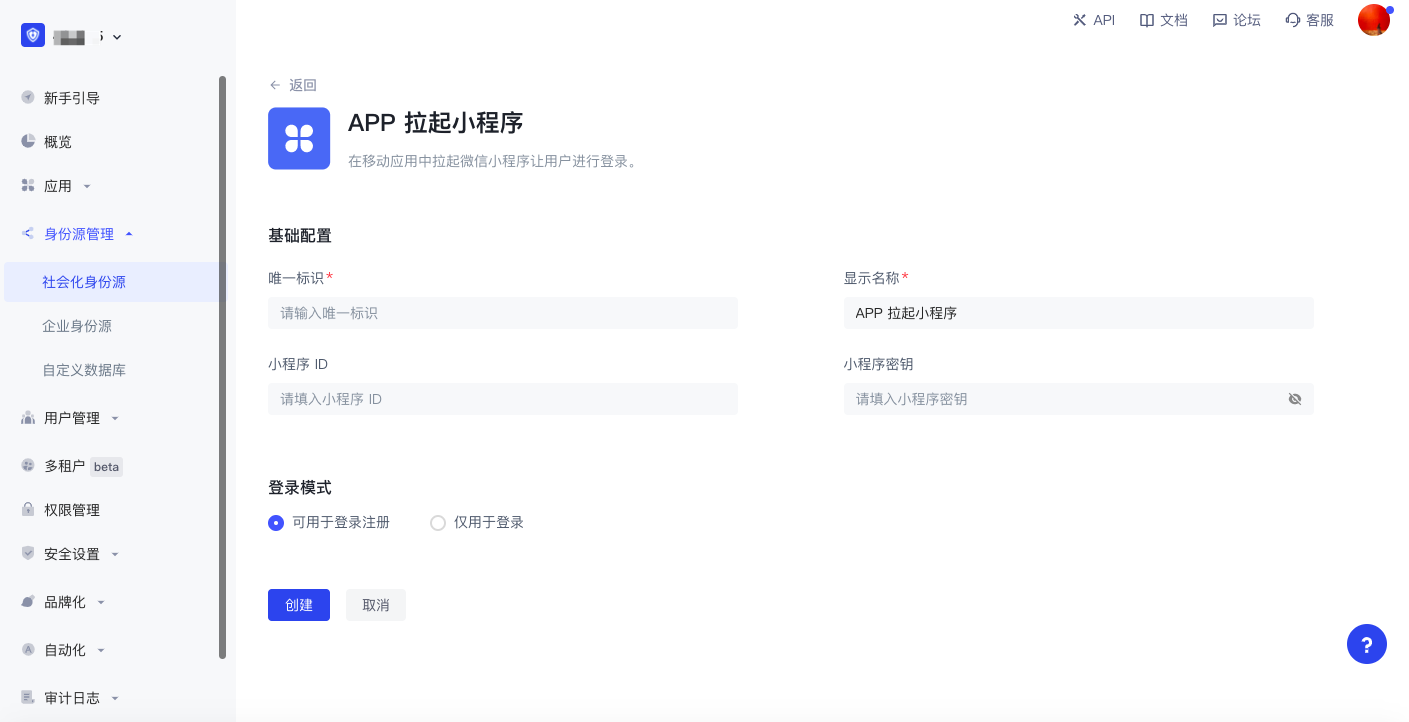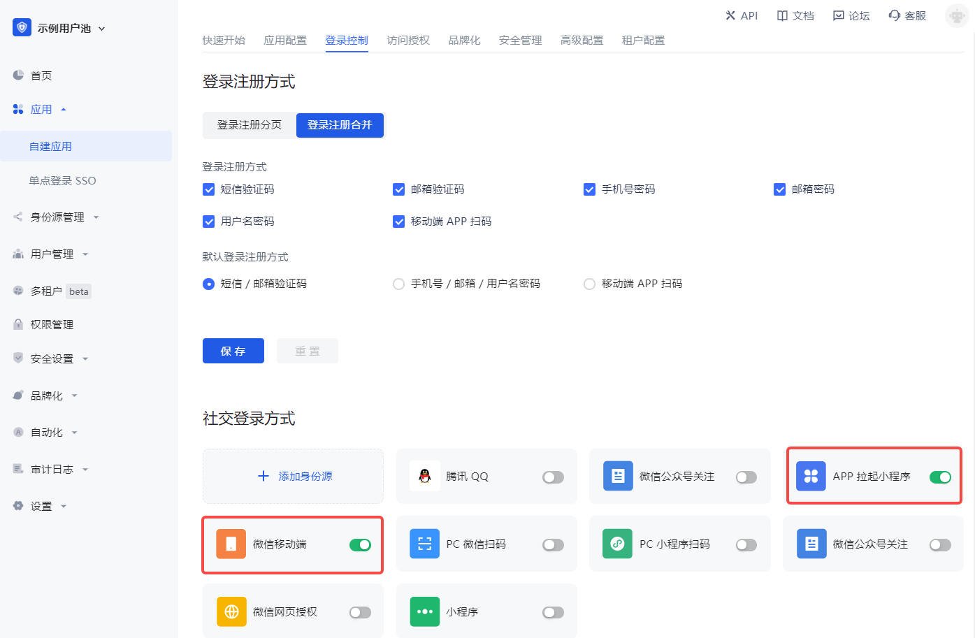 完成第三方登录配置后,在你已经完成集成的应用中开启对应的登录方式: