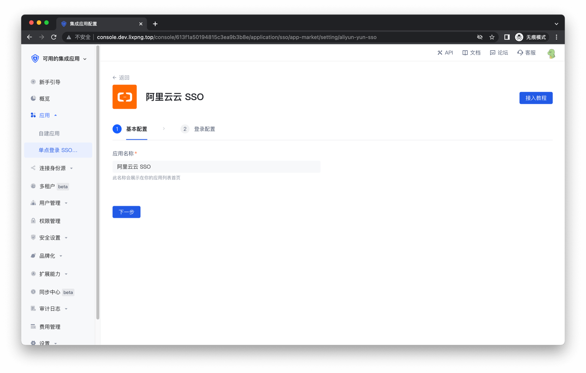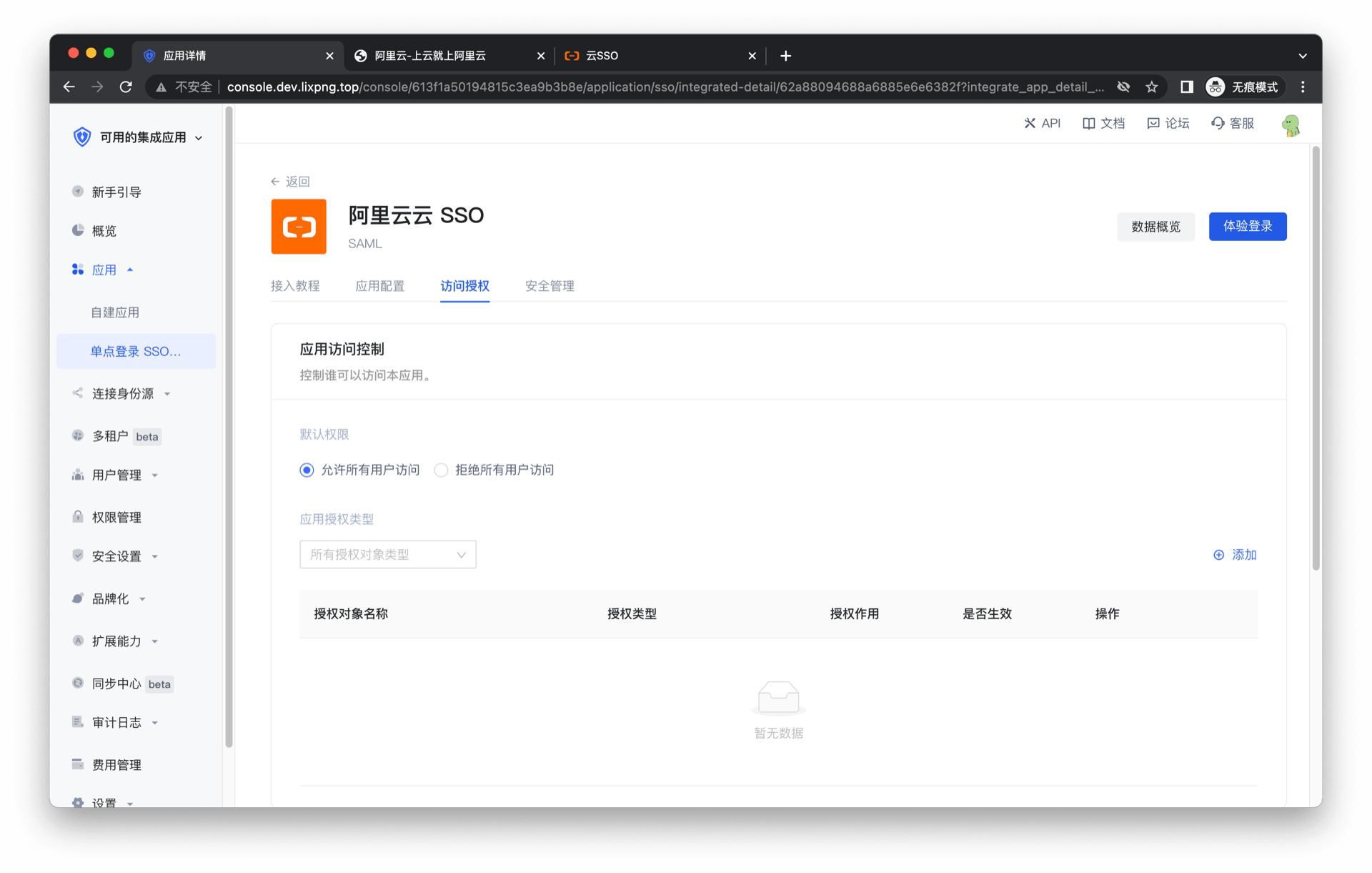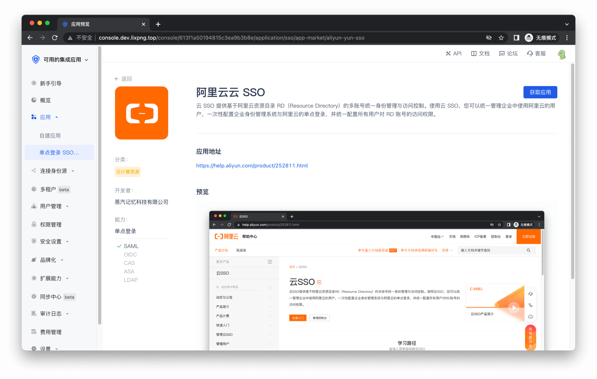 进入控制台 (opens new window) > 应用市场,点击 阿里云云 SSO,点击获取应用。