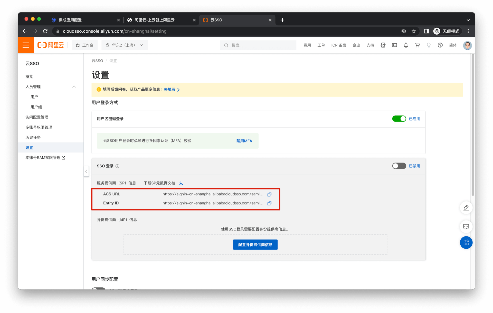 在阿里云创建用户,并开启用户 SSO
