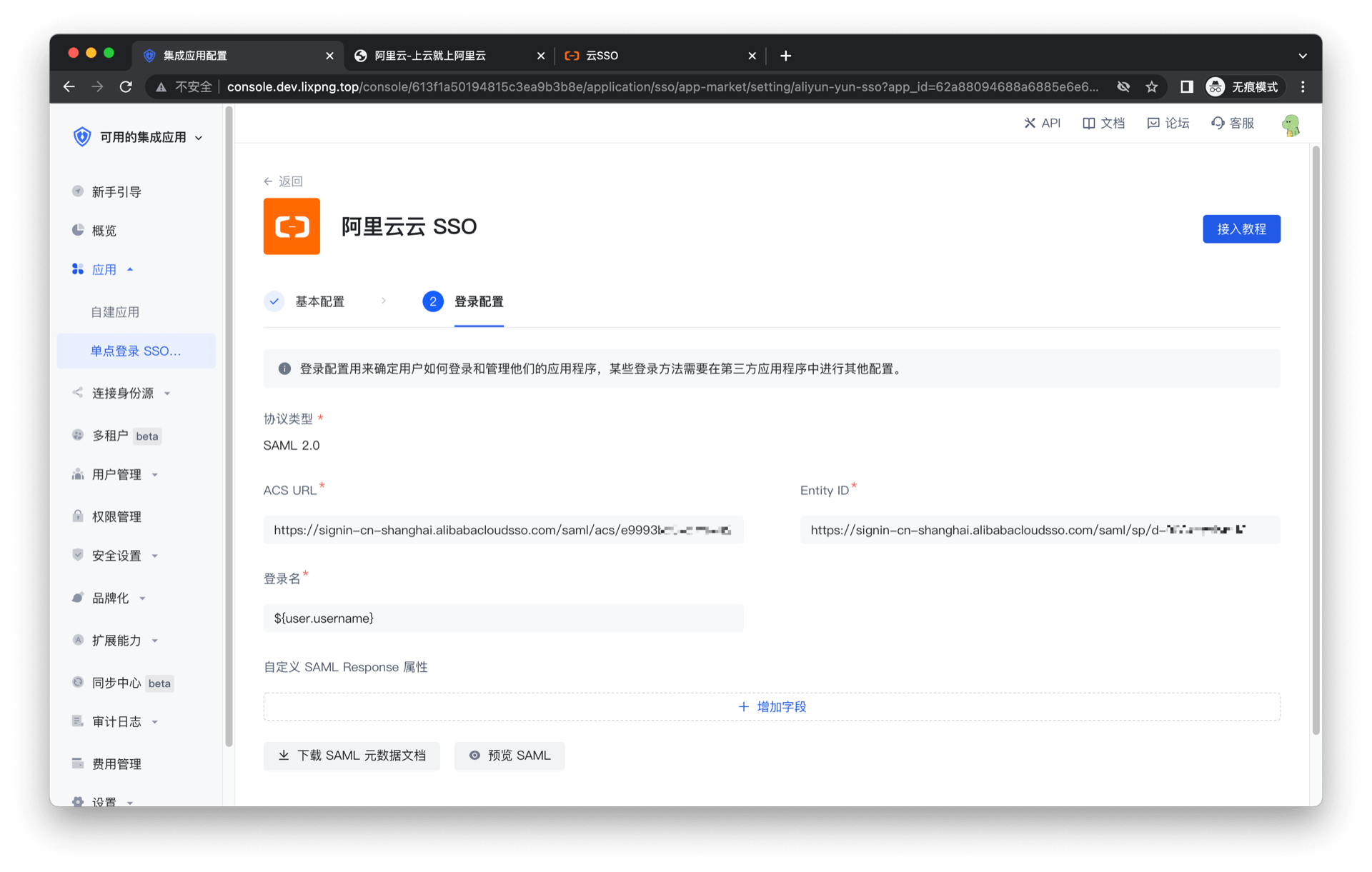 填写 ACS URL 和 Entity ID,值可以从云 SSO 配置界面获取: