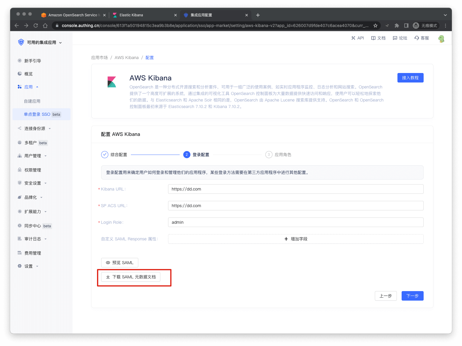 进入控制台 (opens new window) > 单点登录 SSO > 添加应用 ,点击 AWS Kibana,点击获取应用。