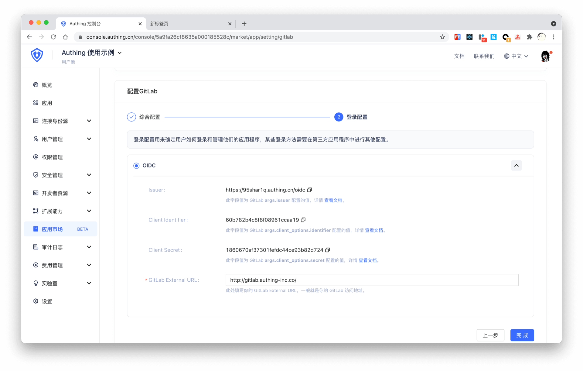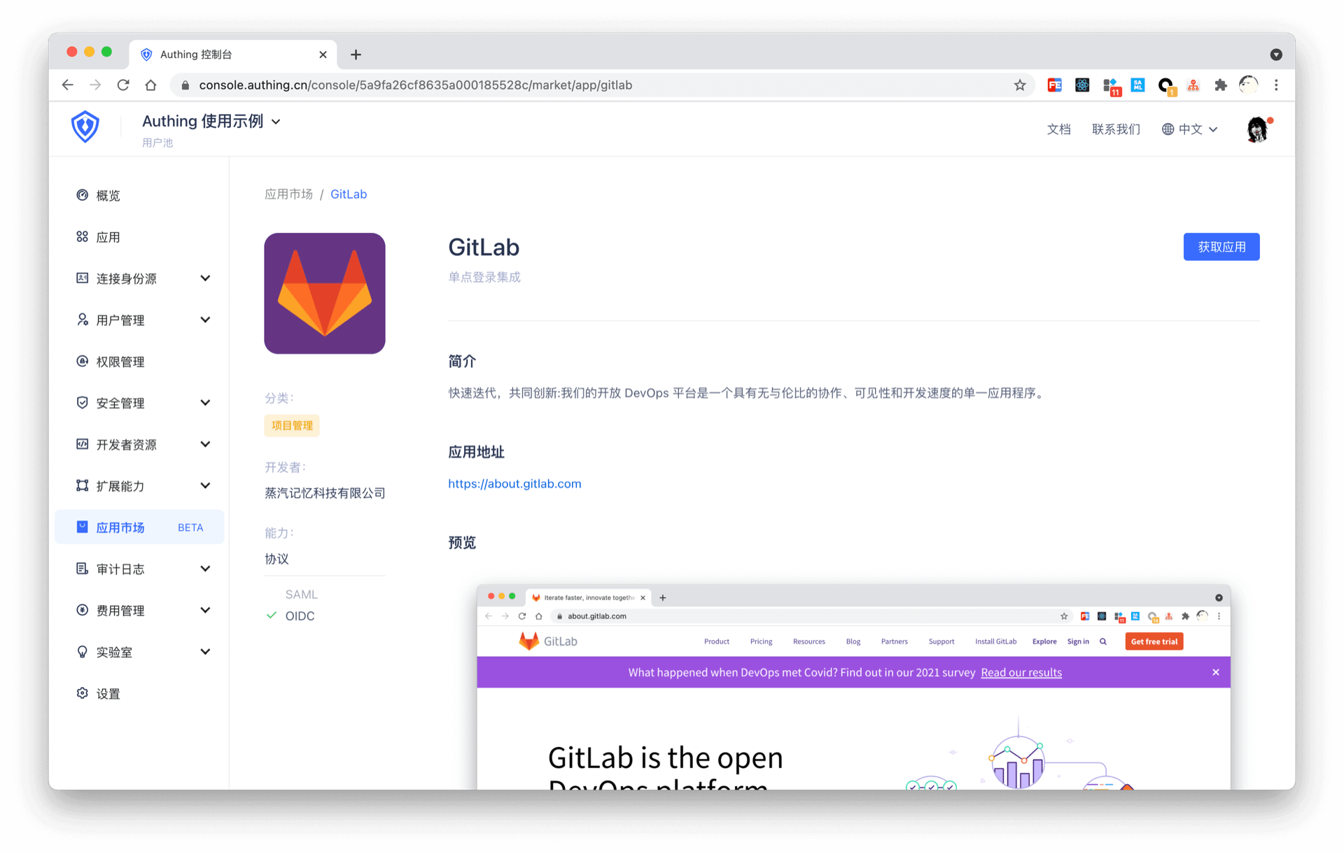 进入控制台 (opens new window) > 单点登录 SSO > 添加应用 ,找到GitLab,点击进入详情,然后点击获取应用。