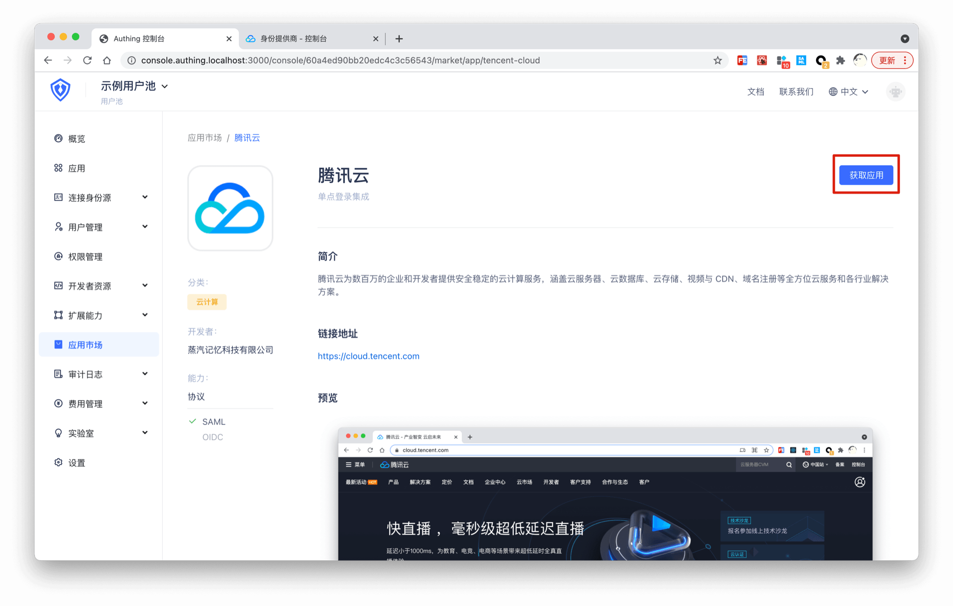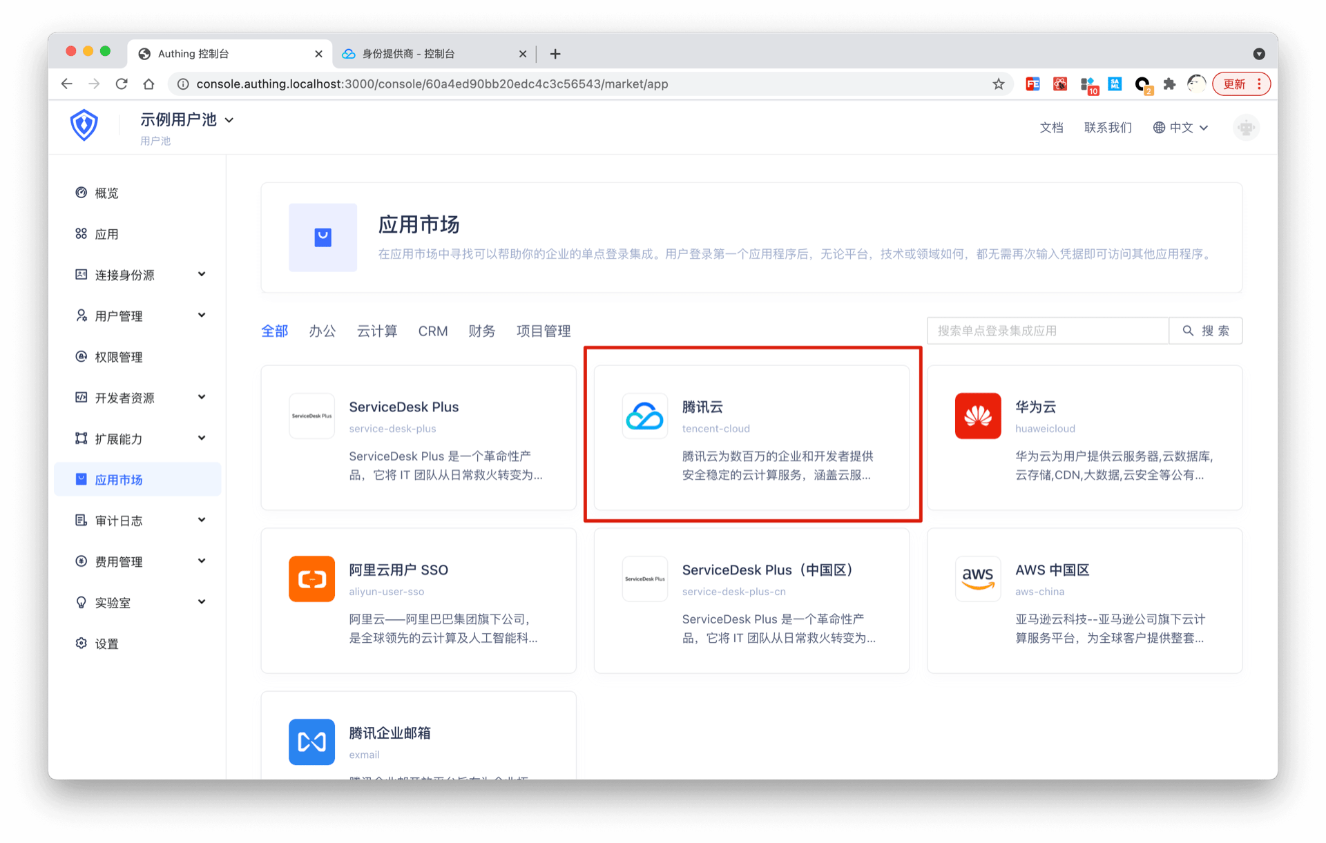 进入控制台 (opens new window) > 单点登录 SSO > 添加应用 ,点击腾讯云。