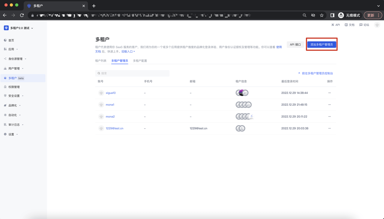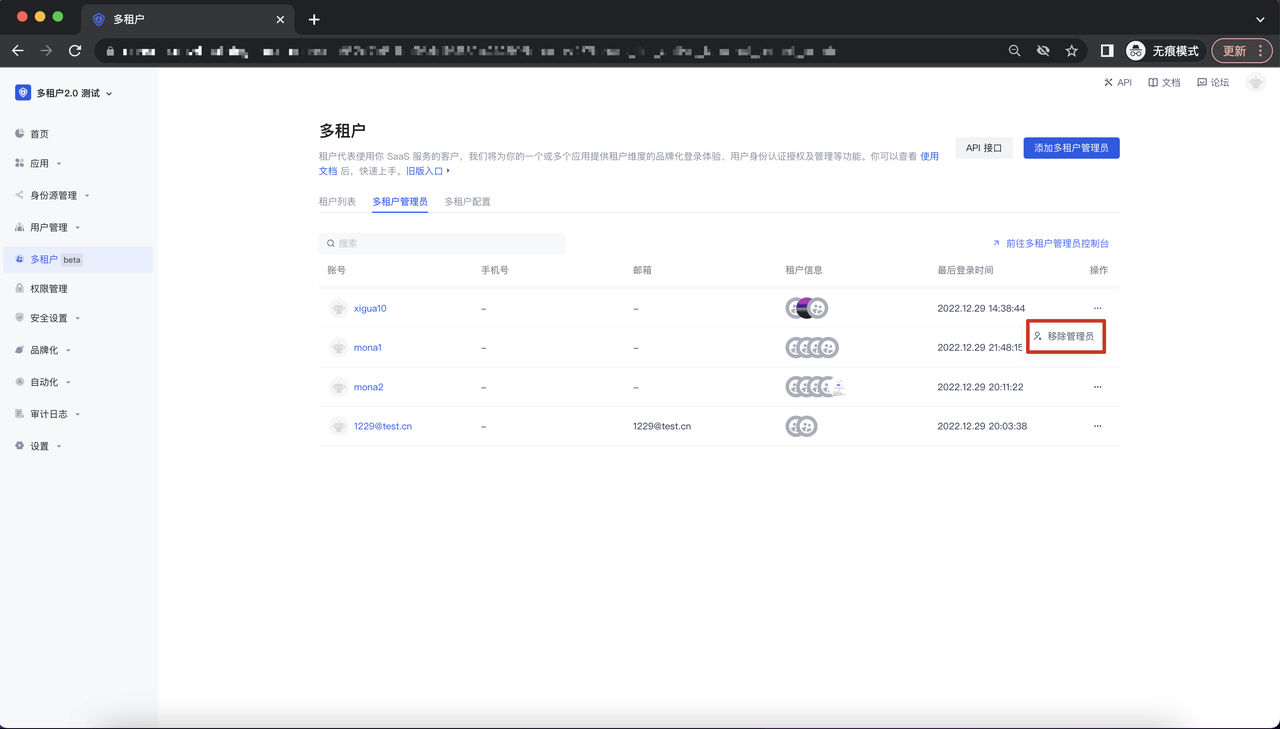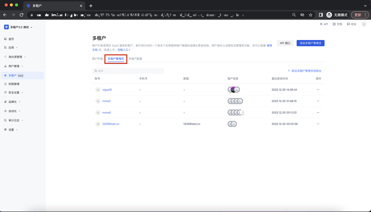 进入多租户模块,点击「多租户管理员」Tab,进入到多租户管理员列表: