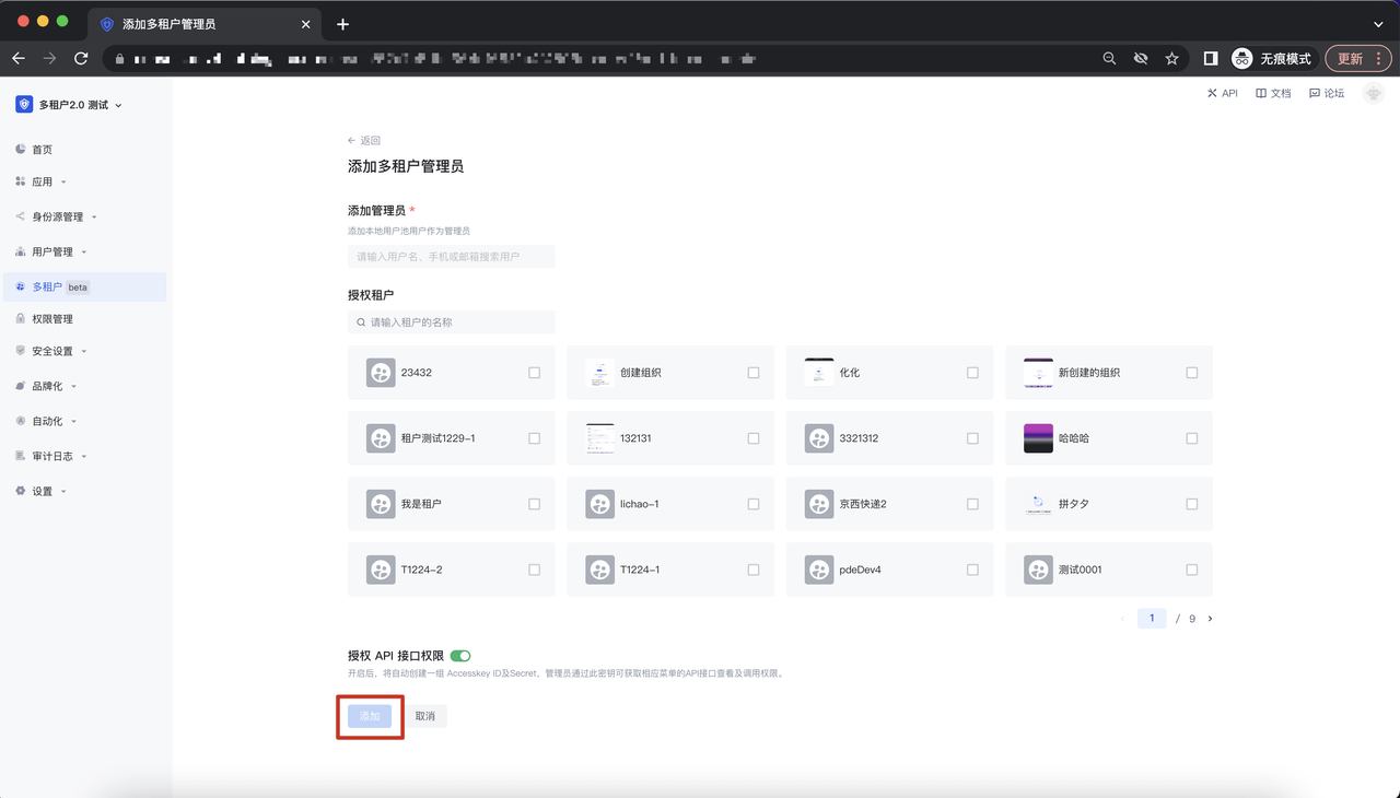 在添加多租户管理员页面,添加相应的用户及授权相关的租户、API 接口权限给到该管理员,点击「添加」即可添加成功;