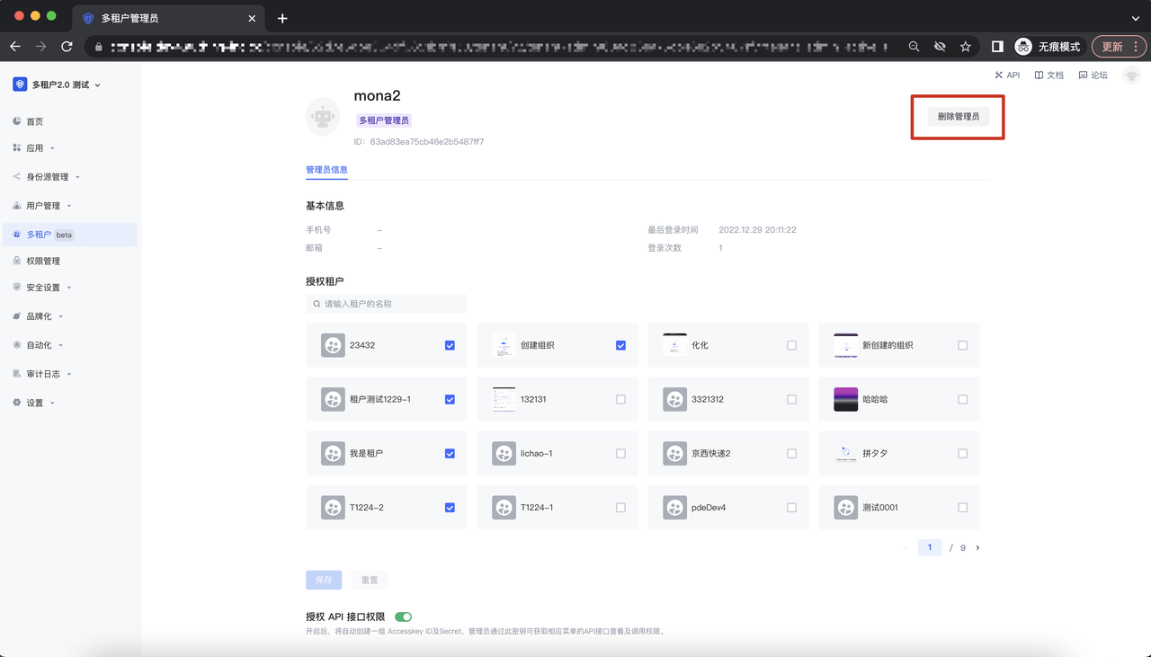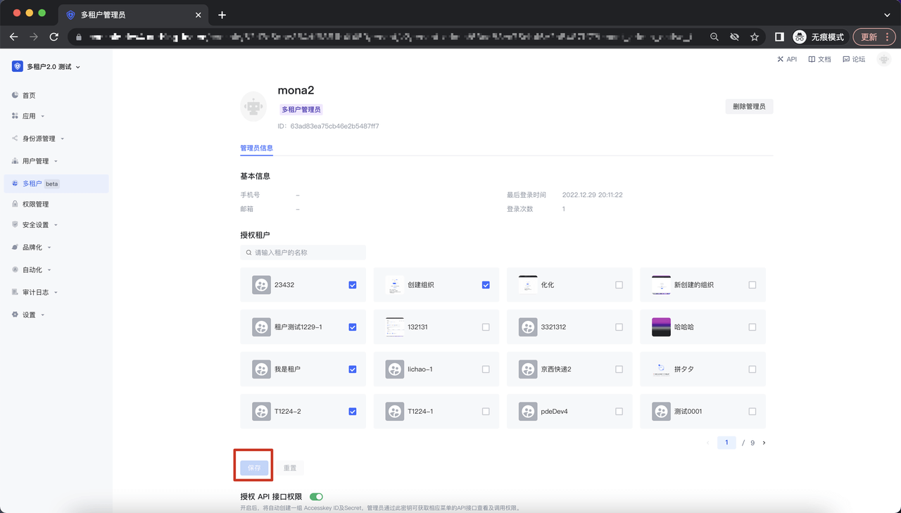 添加完成后,进入到多租户管理员的编辑页面,可以对既有的租户及 API 接口授权进行修改,点击「保存」button 即可完成修改: