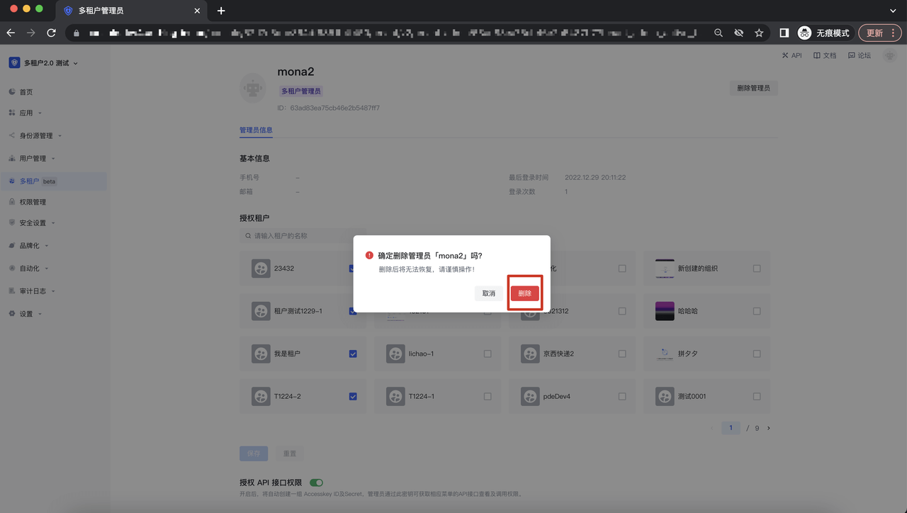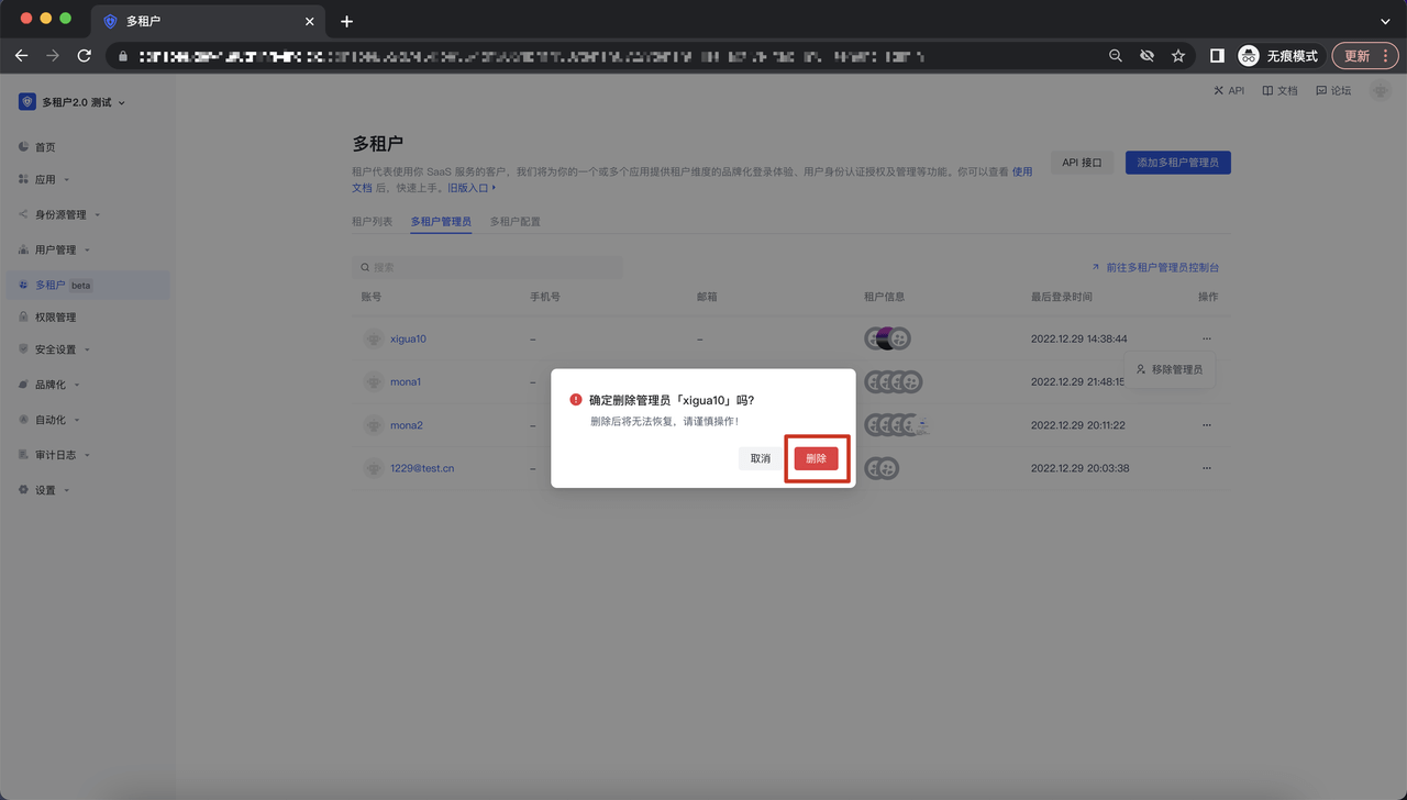 点击删除管理员 button,该管理员就会从多租户管理员 list 被删除;