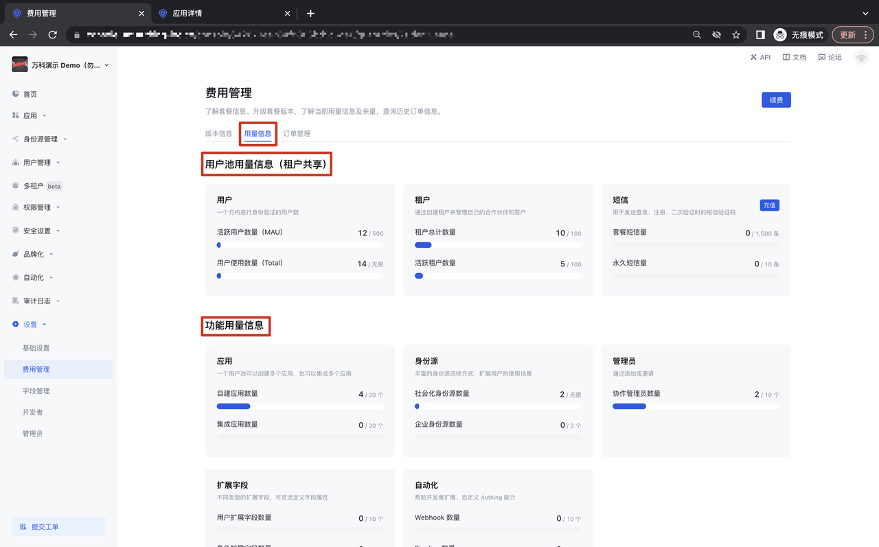 在设置-费用管理-用量信息模块,可以看到该用户池版本的用户池用量信息及功能用量信息,其中用户池用量信息与租户进行共享,功能用户量信息进行用户池级别的单独计量;