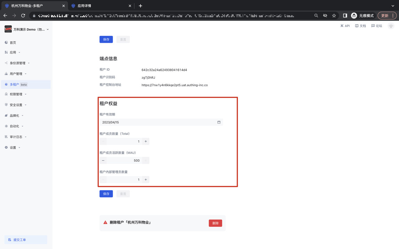 打开「多租户模块」-「租户列表」 Tab,进入某个租户详情页面,在「租户权益」模块,可以对租户的有效期、租户成员数量、租户成员活跃数量、租户内部管理员数量进行限制;