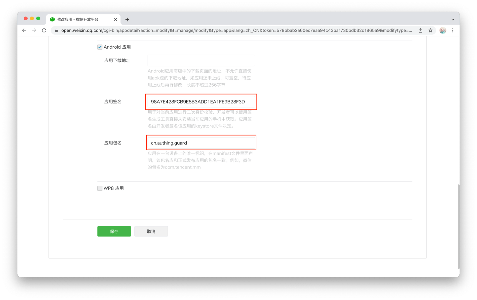 - 填入微信开放平台对应的 AppID 和 AppSecret