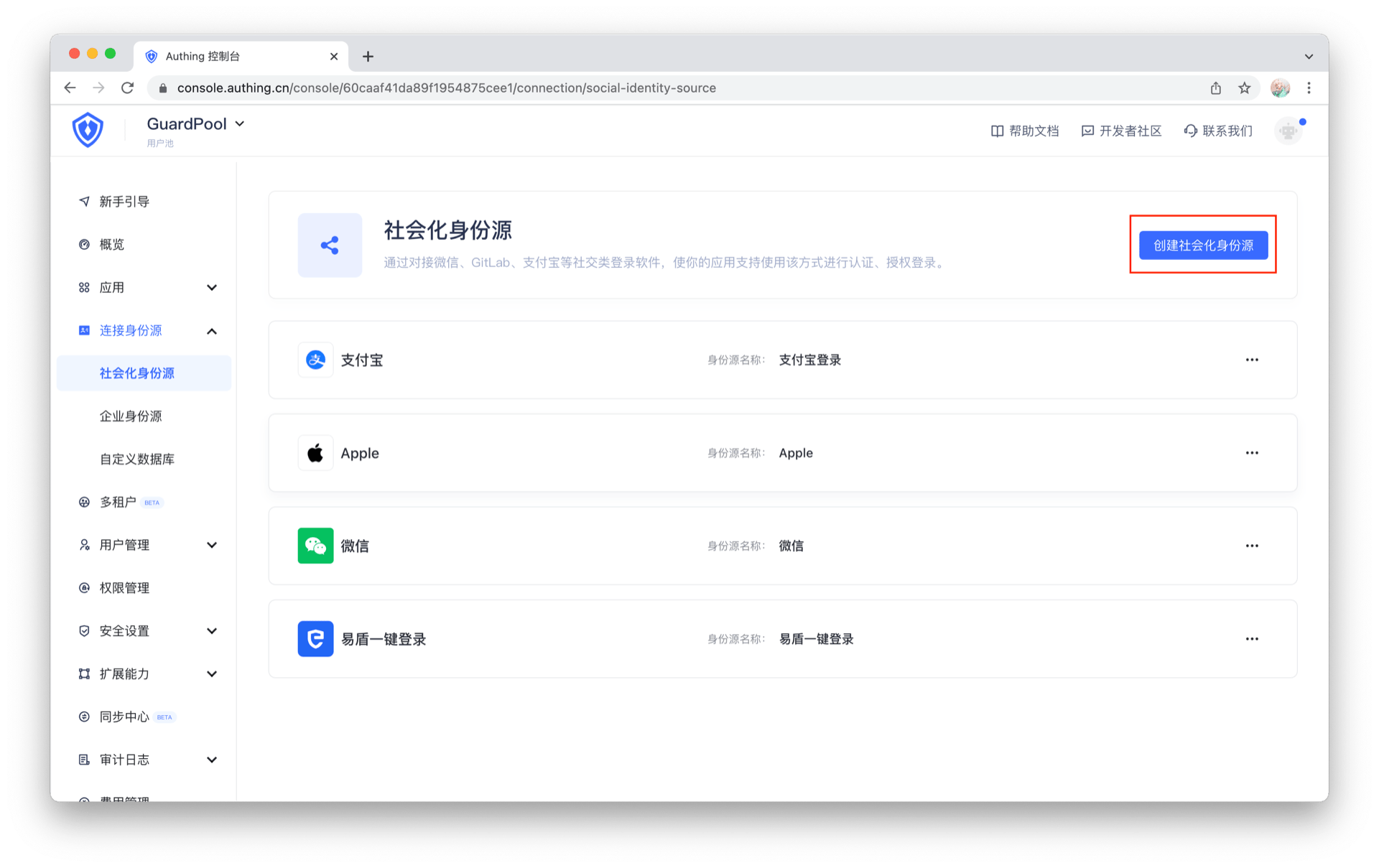 - 在控制台的 “连接身份源” 菜单选择 “创建社交身份源“