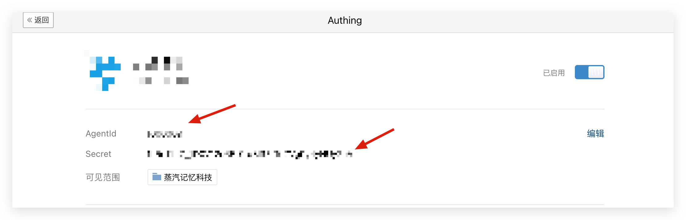 创建完成之后,你可以获取该应用的 AgentId 和 Secret: