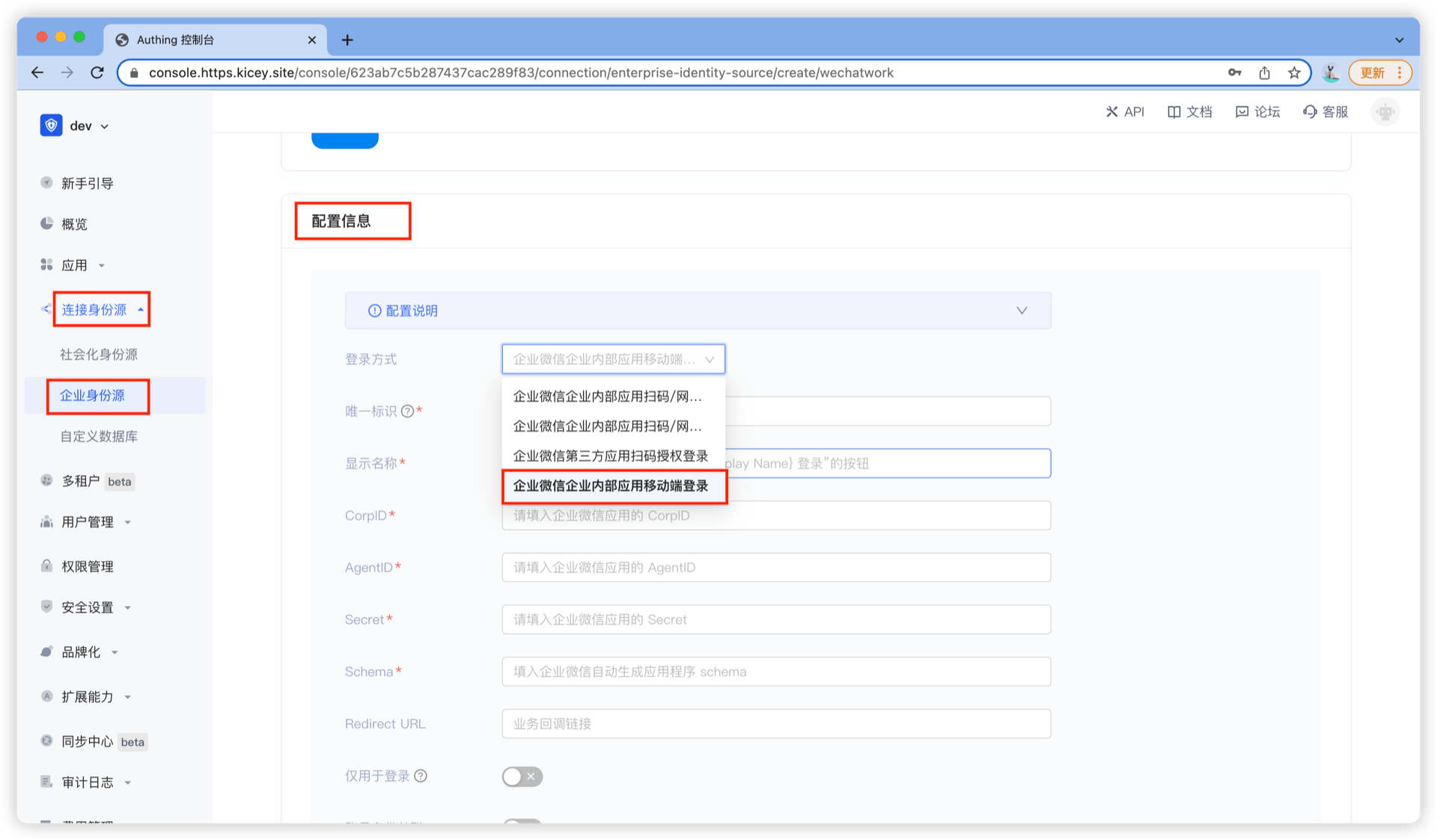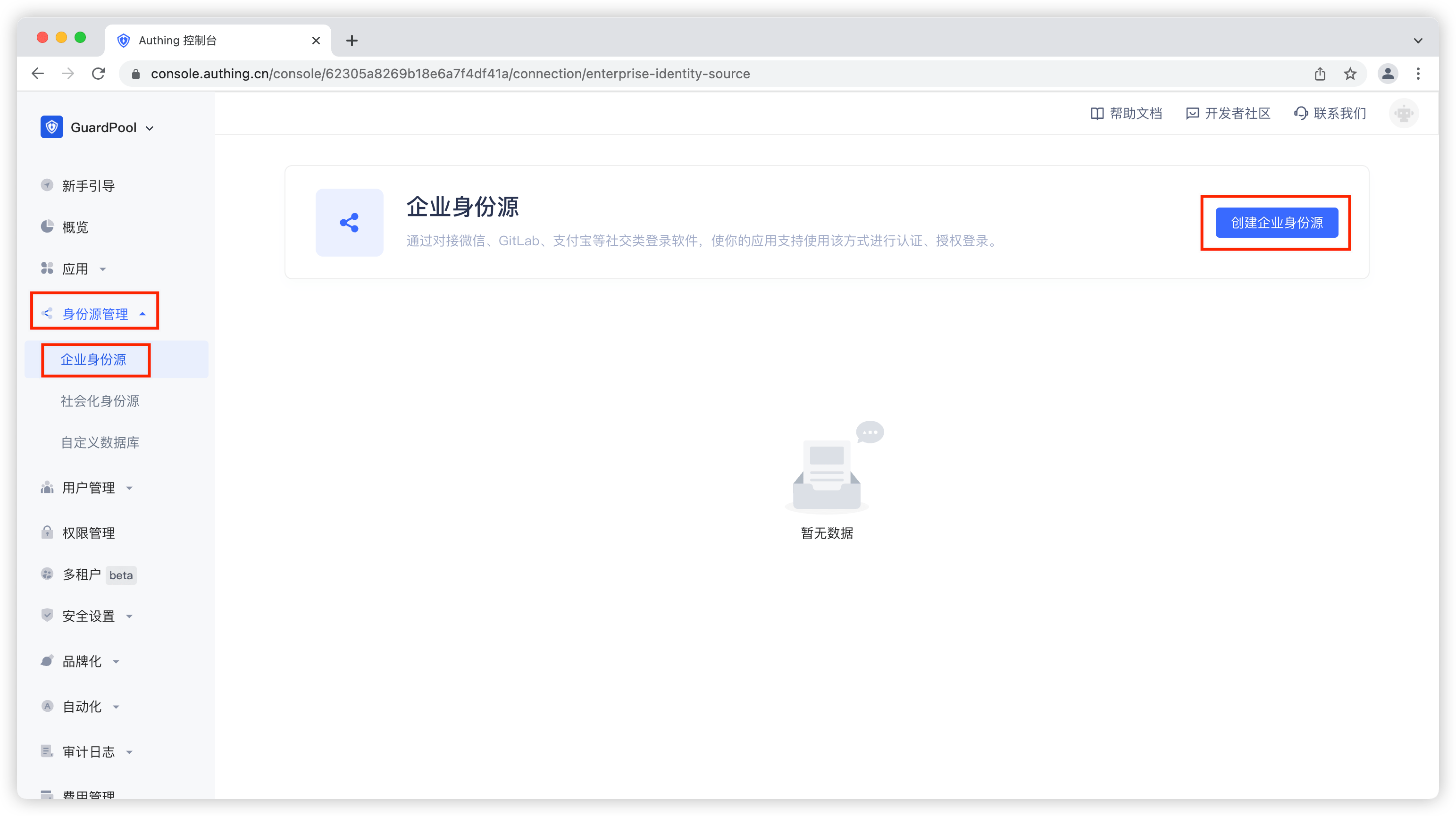 选择或者创建一个用户池—>身份源管理—>企业身份源—>创建企业身份源—>选择企业微信