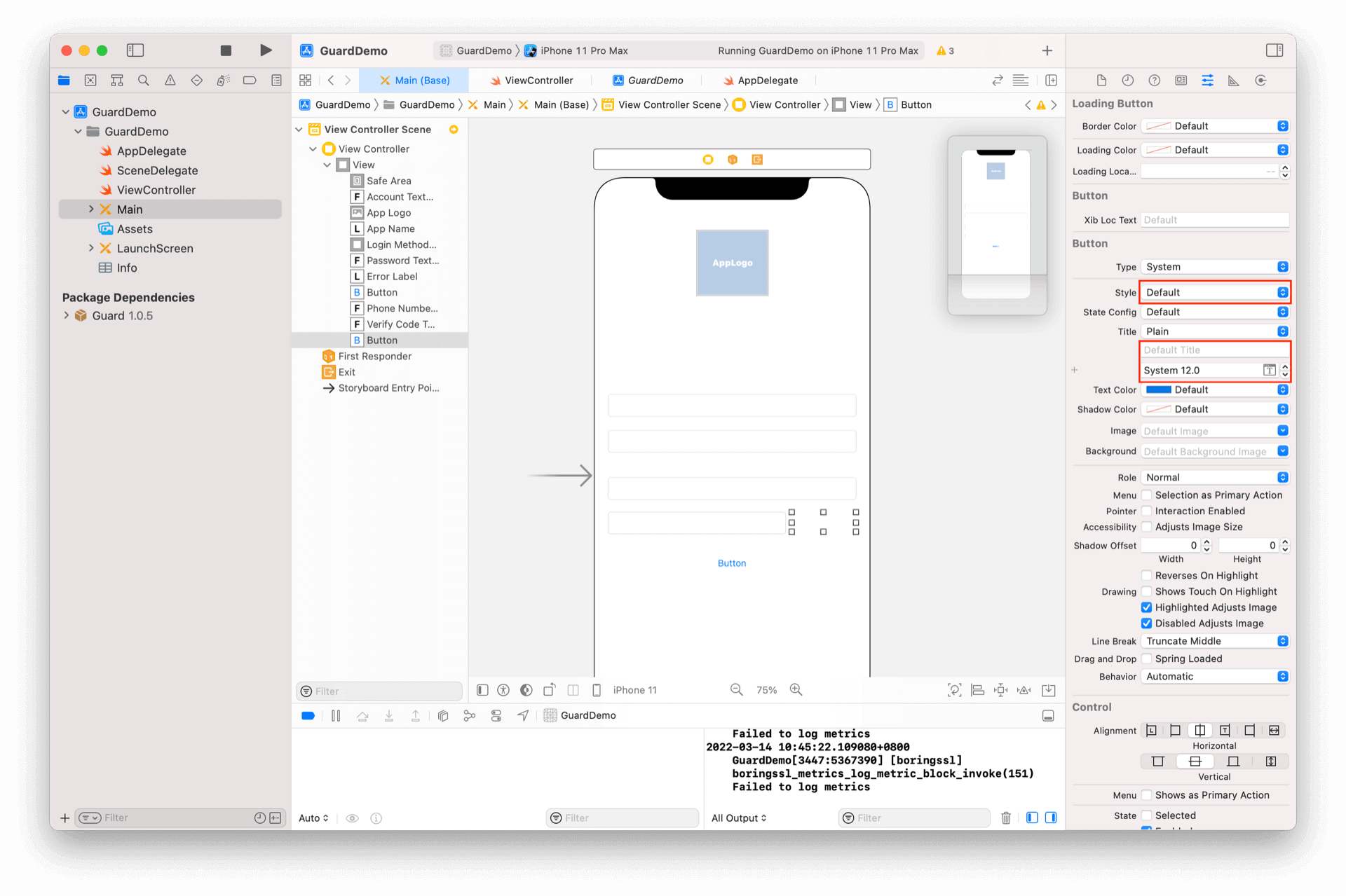iOS 默认按钮文字较大,我们修改一下 GetVerifyCodeButton 的属性,同时去掉默认的 "Button" 文字