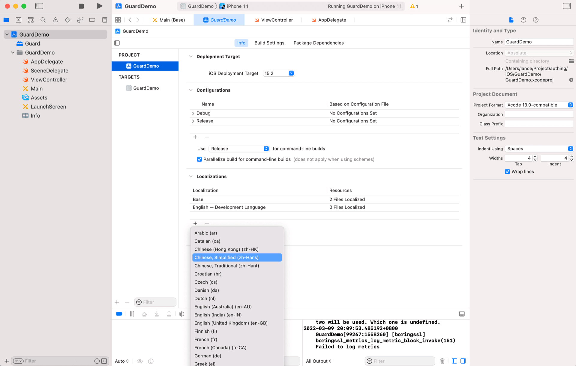 我们注意到界面是英文版本的,因为 iOS 默认只有英文版本的 Localization,并且模拟器默认也是英文版本的。Guard 支持中英文,我们只需要在项目配置里面添加中文即可: