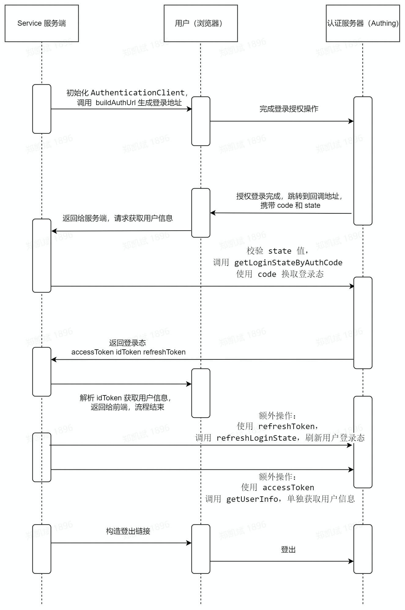 使用方法: 使用 appId 、 appSecret 、 userPoolHost 、 redirectUri 初始化 AuthenticationClient,初始化完成后调用 buildAuthUrl 构造前端登录链接,用户完成登录后,调用 getLoginStateByAuthCode,校验 state 值,并通过 code 码换取 token(Access Token、 ID Token、 Refresh Token),获得用户登录态,登录结束后,可调用 buildLogoutUrl 生成登出 URL。用户点击后触发登出,完成整个登录登出流程。