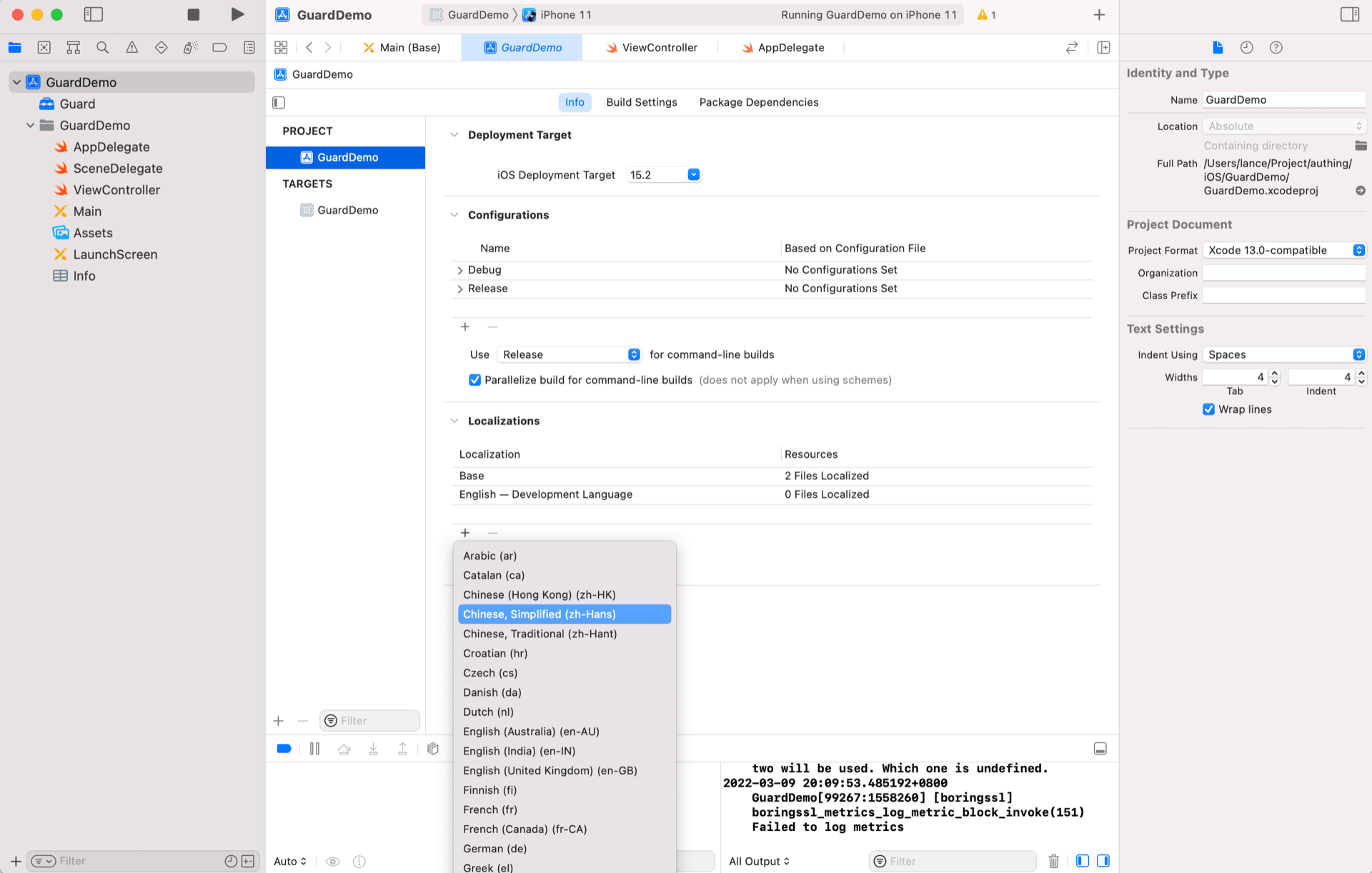 我们注意到界面是英文版本的,因为 iOS 默认只有英文版本的 Localization,并且模拟器默认也是英文版本的。Guard 支持中英文,我们只需要在项目配置里面添加中文即可: