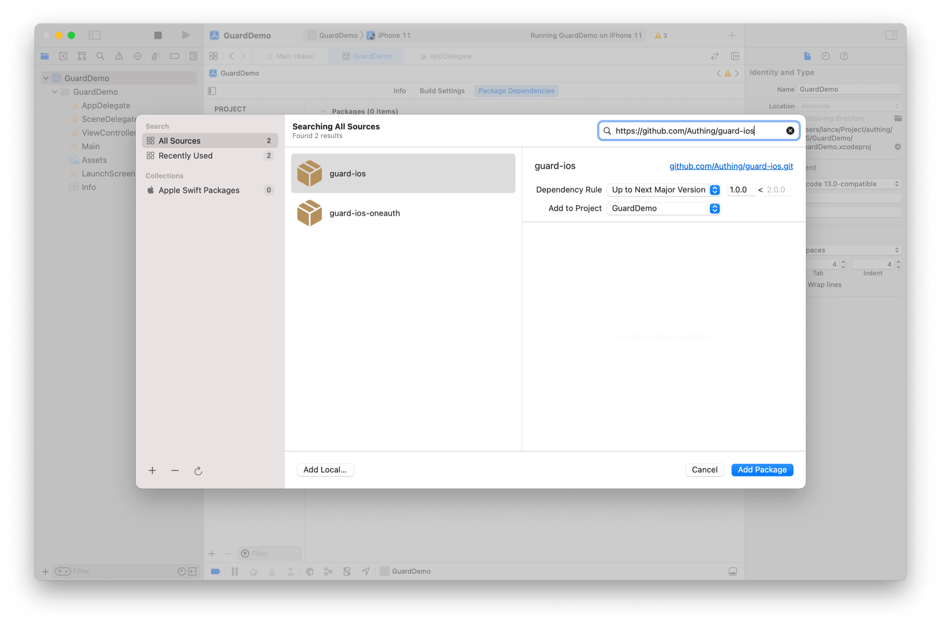 在 Swift Package 搜索栏输入:https://github.com/Authing/guard-ios 。