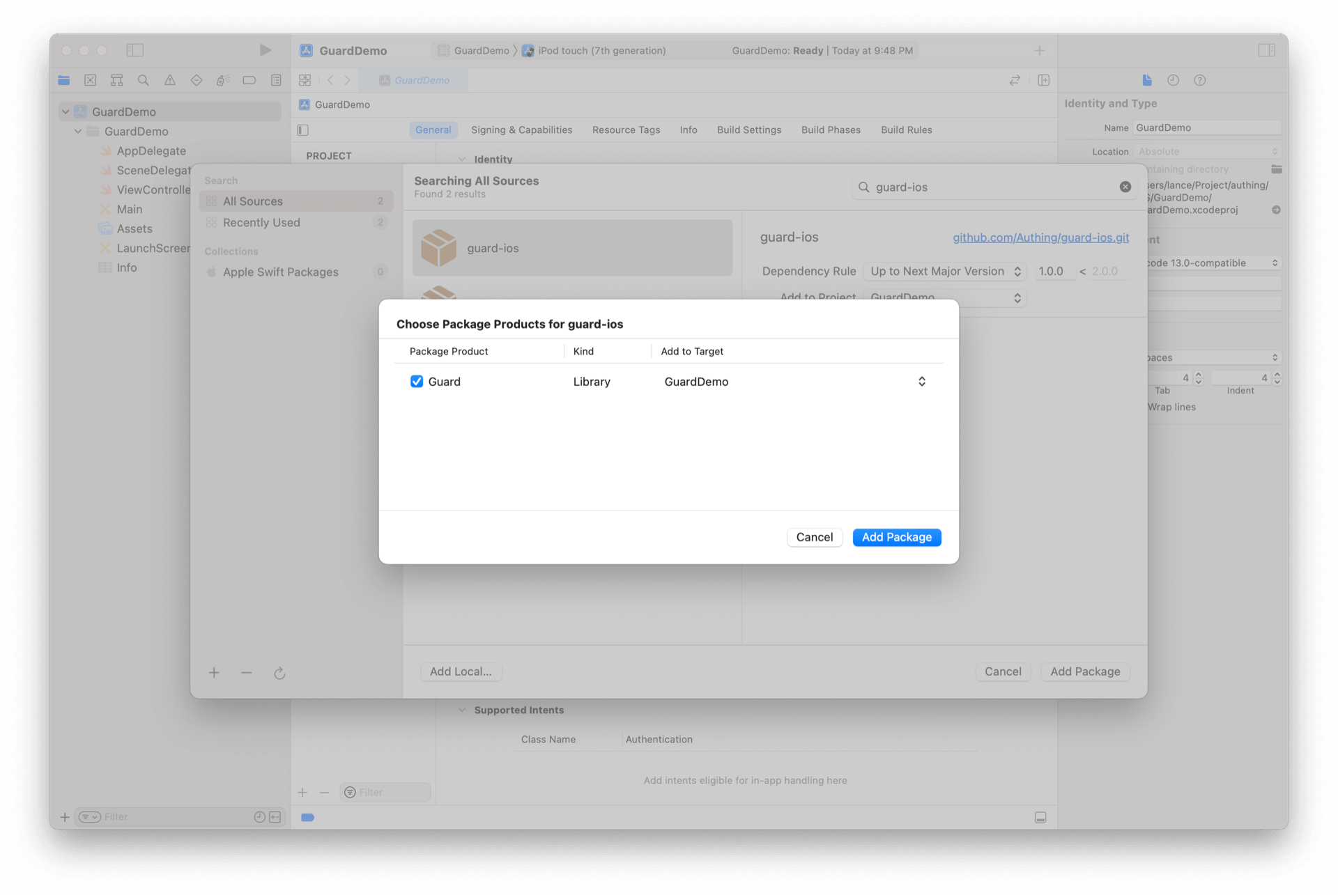 如遇到 Swift Package 链接访问下载缓慢的情况,也可以在 Realese 版本 (opens new window)中下载最新版本 Guard.xcframework 的 zip 包,解压后手动导入本地工程。