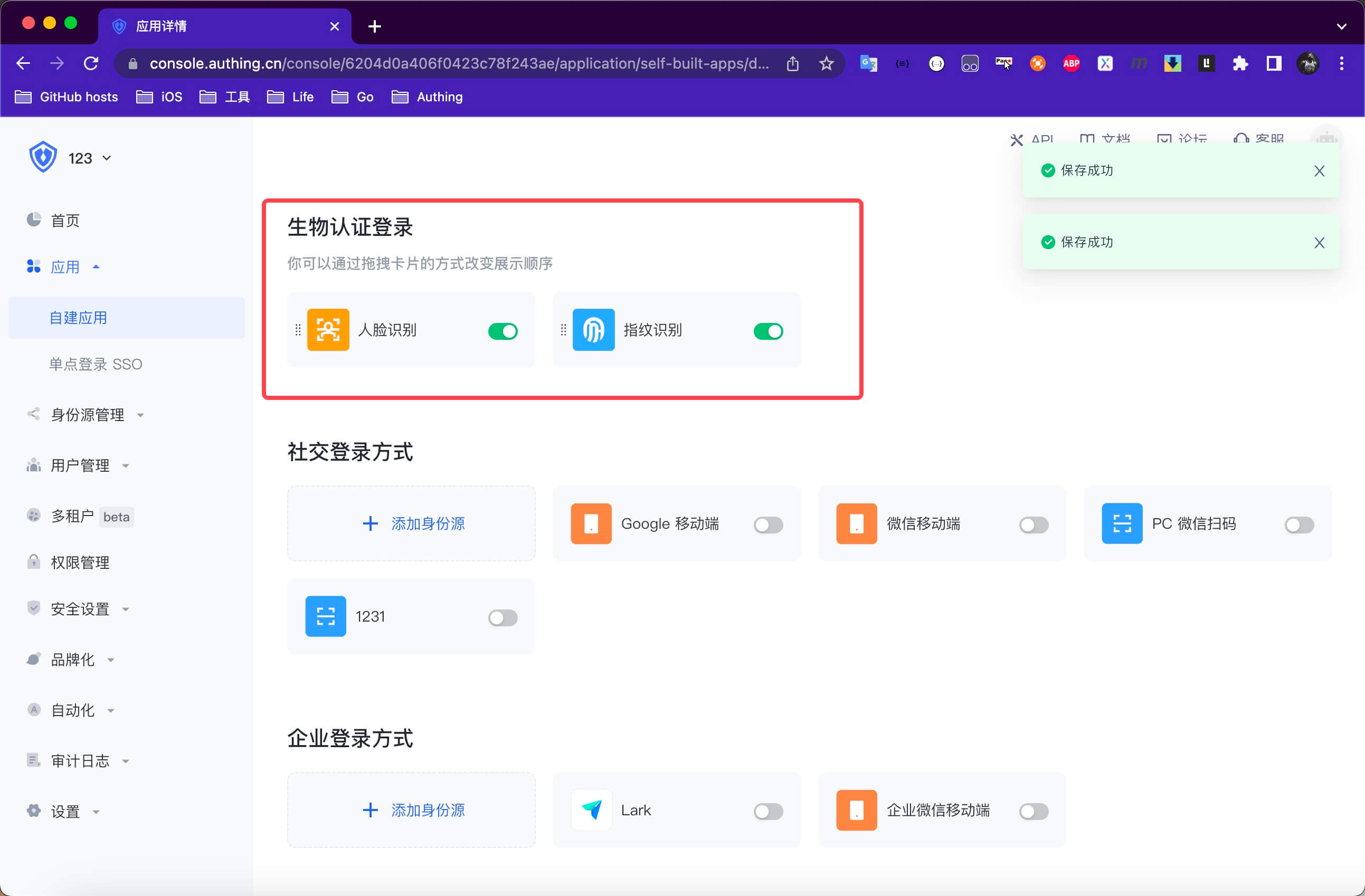 ¶ 第一步:在 Authing 管理控制台 (opens new window) 打开生物认证