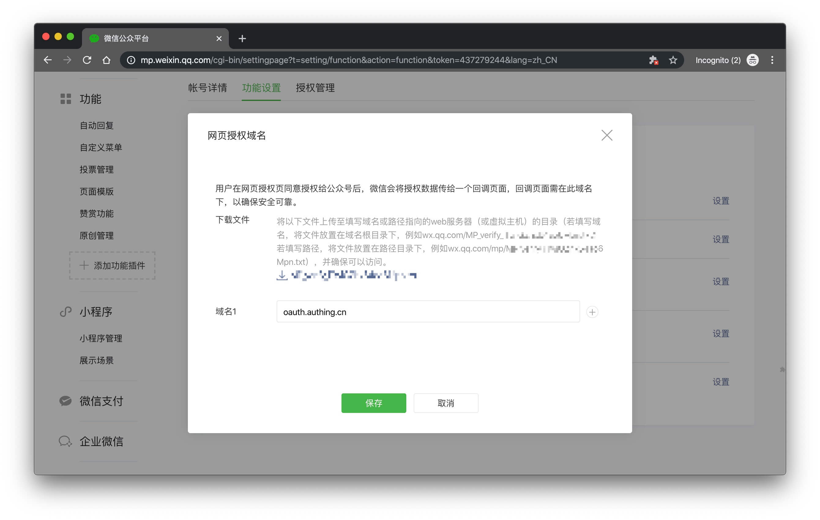 出于安全验证考虑,微信服务器需要和 Authing 服务器做一次请求验证,开发者需要下载 txt 文件,并记录 文件名 和 文本内容。